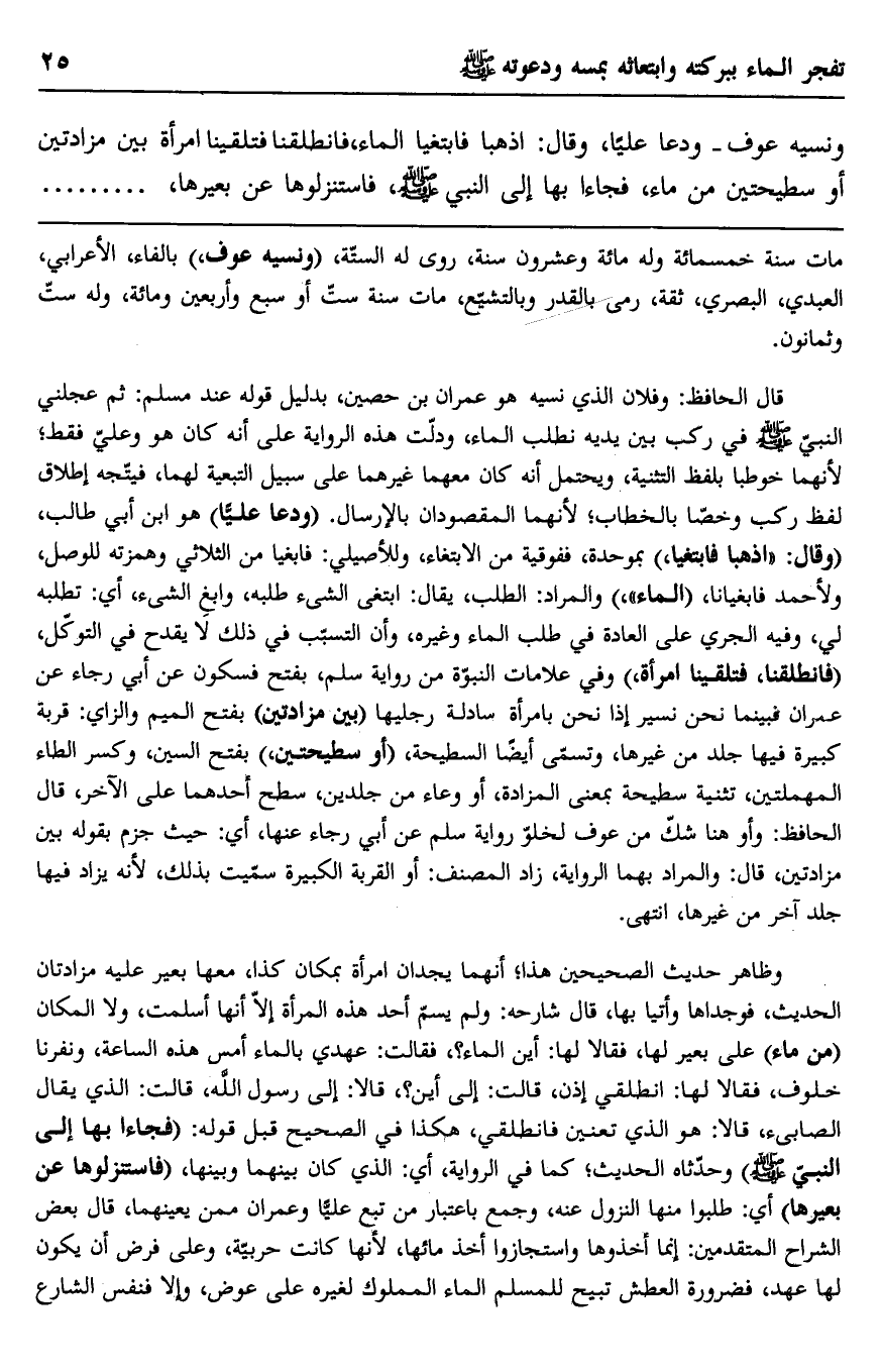 ونسيه عوف -ودعا عليا، وقال: "اذهبا فابتغيا الماء". فانطلقنا فتلقينا امرأة بين مزادتين أو سطيحتين من ماء، فجاءوا بها إلى النبي صلى الله عليه وسلم، فاستنزلوها عن بعيرها