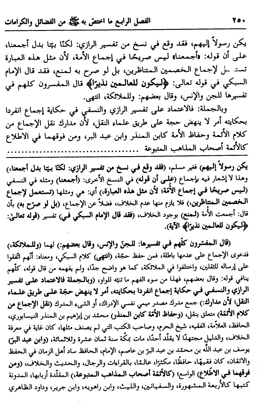 يكن رسولا إليهم، فقد وقع في نسخ من تفسير الرازي: لكنا بينا بدل أجمعنا، على أن قوله: "أجمعنا" ليس صريحًا في إجماع الأمة، لأن مثل هذه العبارة تستعمل لإجماع الخصمين المتناظرين، بل لو صرح به لمنع، فقد قال الإمام السبكي في قوله تعالى: {لِيَكُونَ لِلْعَالَمِينَ نَذِيرًا} قال المفسرون كلهم في تفسيرها للجن والإنس، وقال بعضهم: وللملائكة، انتهى.