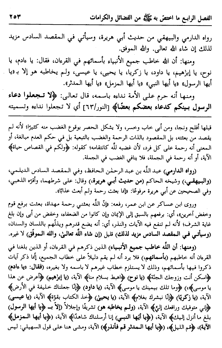 "ومنها: أن الله خاطب جميع الأنبياء" الذين ذكرهم في القرآن، أو الذين بلغنا في القرآن أنه خاطبهم "بأسمائهم" فلا يرد أنه لم يقم دليلا على خطاب الجميع، إنما ذكر آيات ذكروا فيها بأسمائهم، وذلك لا يستلزم خطاب غيرهم لا باسمه ولا بغيره، "فقال: يا آدم" {اسْكُنْ أَنْتَ وَزَوْجُكَ الْجَنَّةَ} "يا نوح" {اهْبِطْ بِسَلَامٍ مِنَّا} الآية، "يا إبراهيم" {أَعْرِضْ عَنْ هَذَا} "يا موسى" {وَمَا تِلْكَ بِيَمِينِكَ يَا مُوسَى} الآية، "يا داود" {إِنَّا جَعَلْنَاكَ خَلِيفَةً فِي الْأَرْضِ} الآية، "يا زكريا" {إِنَّا نُبَشِّرُكَ بِغُلَامٍ} الآية، "يا يحيى" {خُذِ الْكِتَابَ بِقُوَّةٍ} الآية، "يا عيسى" {إِنِّي مُتَوَفِّيكَ وَرَافِعُكَ إِلَي} الآية، "ولم يخاطبه هو" تشريفًا وإجلالا "إلا بـ {يَا أَيُّهَا الرَّسُول بَلِّغْ مَا أُنْزِلَ إِلَيْكَ} الآية، {يَا أَيُّهَا النَّبِيُّ إِنَّا أَرْسَلْنَاكَ شَاهِدًا} الآية، {يَا أَيُّهَا الْمُزَّمِّلُ} الآية، {قُمِ اللَّيْلَ} ، {يَا أَيُّهَا الْمُدَّثِّرُ، قُمْ فَأَنْذِرْ} الآية، ومشى هنا على قول السهيلي: ليس
