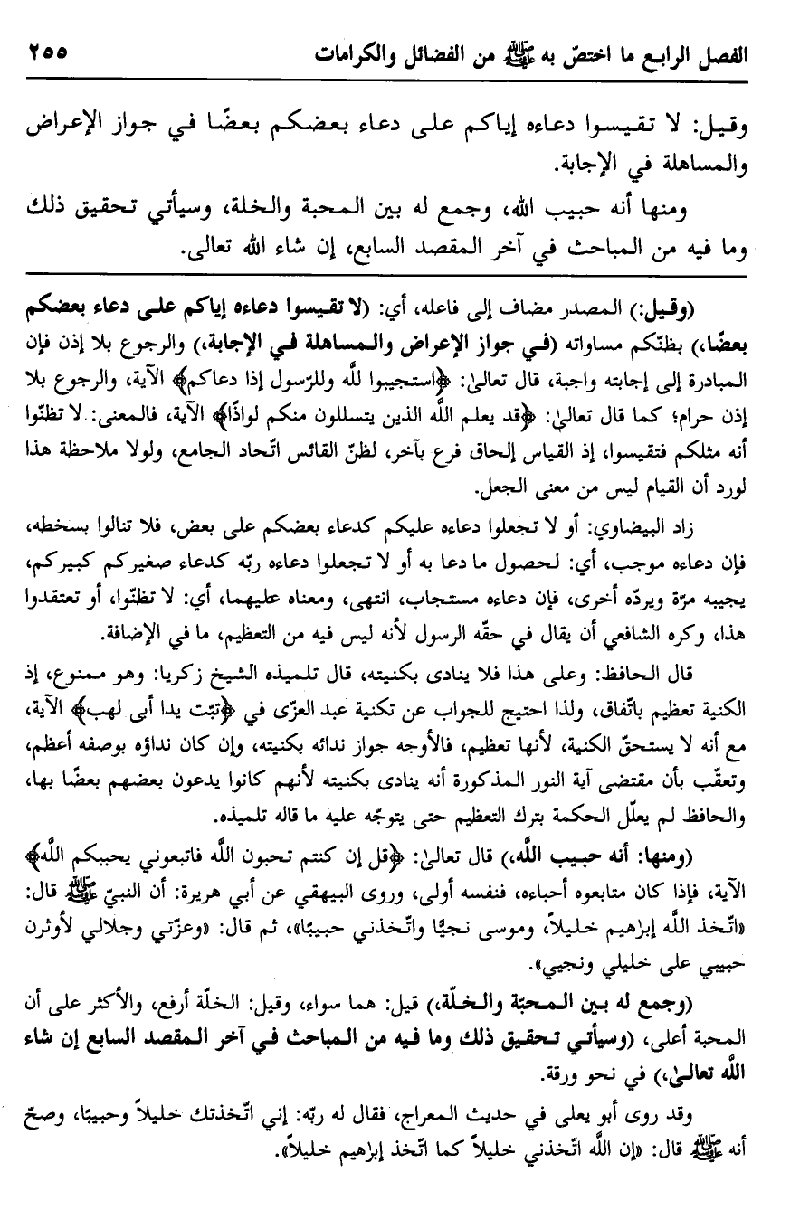 "ومنها: أنه حبيب الله" قال تعالى: {قُلْ إِنْ كُنْتُمْ تُحِبُّونَ اللَّهَ فَاتَّبِعُونِي يُحْبِبْكُمُ اللَّهُ} الآية، فإذا كان متابعوه أحباءه، فنفسه أولى، وروى البيهقي عن أبي هريرة: أن النبي صلى الله عليه وسلم قال: "اتخذ الله إبراهيم خليلا، وموسى نجيًا واتخذني حبيبًا"، ثم قال: "وعزتي وجلالي لأوثرن حبيبي على خليلي ونجيي".