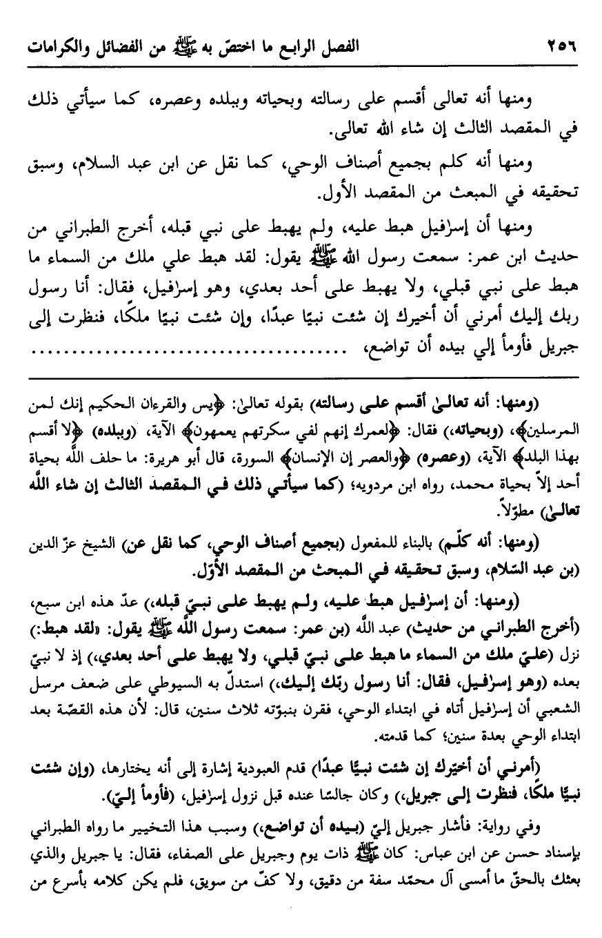 ومنها أن إسرافيل هبط عليه، ولم يهبط على نبي قبله، أخرج الطبراني من حديث ابن عمر: سمعت رسول الله صلى الله عليه وسلم يقول: "لقد هبط علي ملك من السماء ما هبط على نبي قبلي، ولا يهبط على أحد بعدي، وهو إسرافيل، فقال: أنا رسول ربك إليك أمرني أن أخيرك إن شئت نبيًا عبدًا، وإن شئت نبيًا ملكًا، فنظرت إلى جبريل فأومأ إليّ بيده أن تواضع
