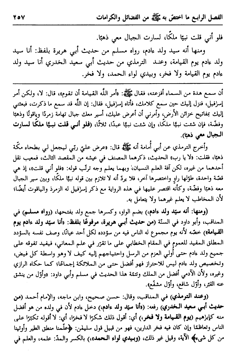 ومنها أنه سيد ولد آدم، رواه مسلم من حديث أبي هريرة بلفظ: "أنا سيد ولد آدم يوم القيامة"، وعند الترمذي من حديث أبي سعيد الخدري: "أنا سيد ولد آدم يوم القيامة ولا فخر، وبيدي لواء الحمد، ولا فخر".