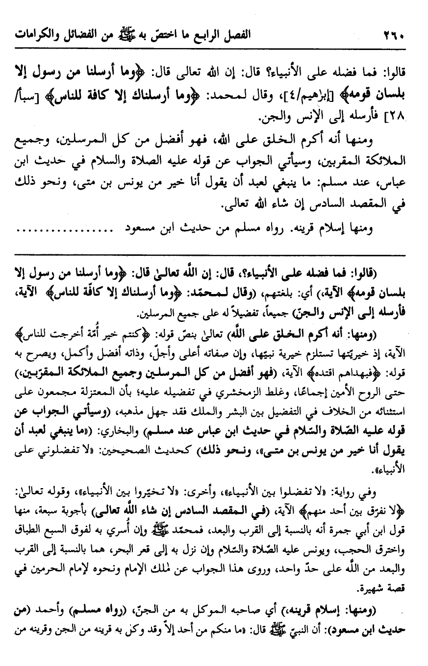 قالوا: فما فضله على الأنبياء؟ قال: إن الله تعالى قال: {وَمَا أَرْسَلْنَا مِنْ رَسُولٍ إِلَّا بِلِسَانِ قَوْمِهِ} [إبراهيم: 4] ، وقال لمحمد: {وَمَا أَرْسَلْنَاكَ إِلَّا كَافَّةً لِلنَّاسِ} [سبأ: 28] فأرسله إلى الإنس والجن.