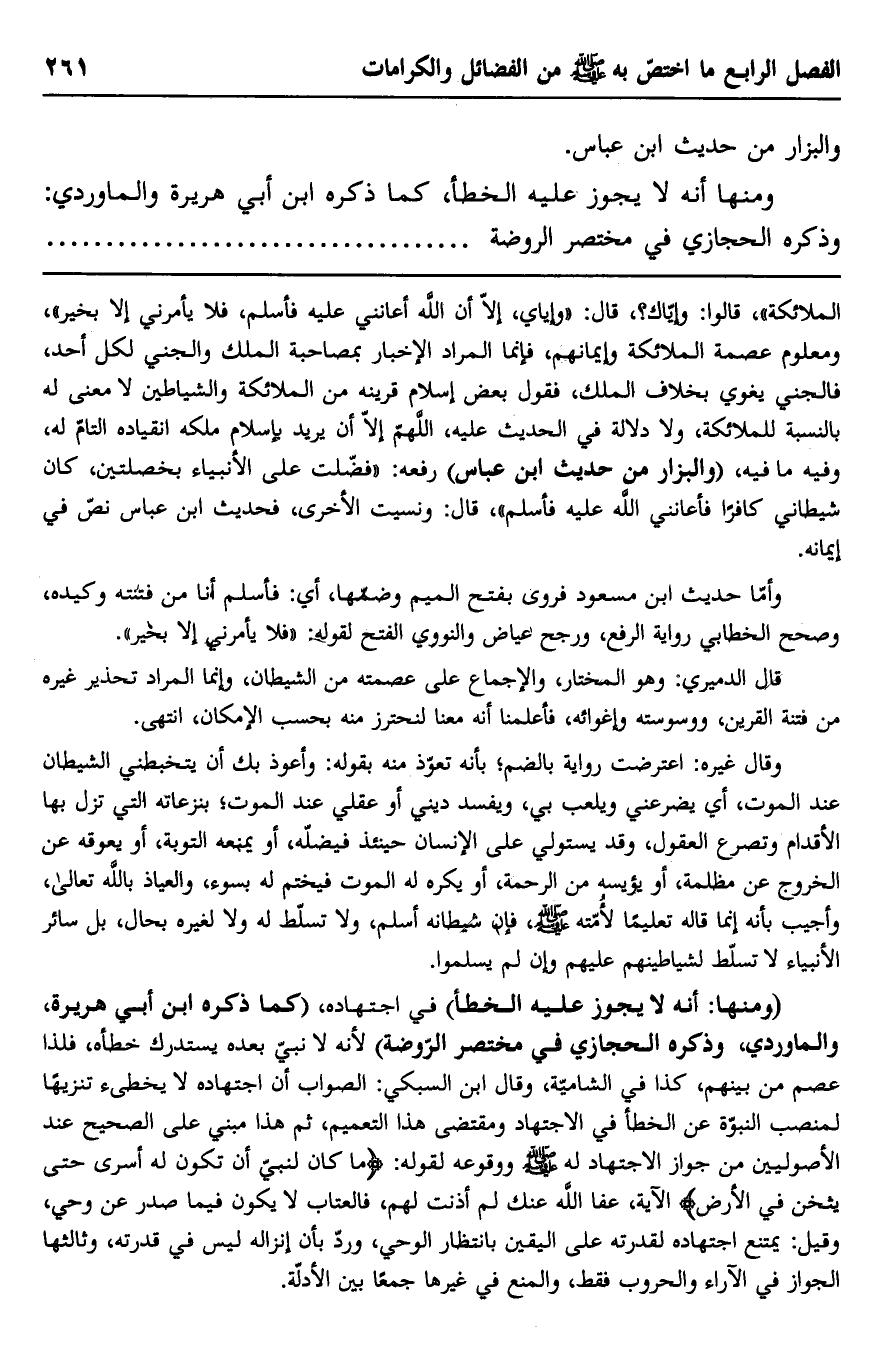 ومنها أنه لا يجوز عليه الخطأ، كما ذكره ابن أبي هريرة والماوردي: وذكره الحجازي في مختصر الروضة.