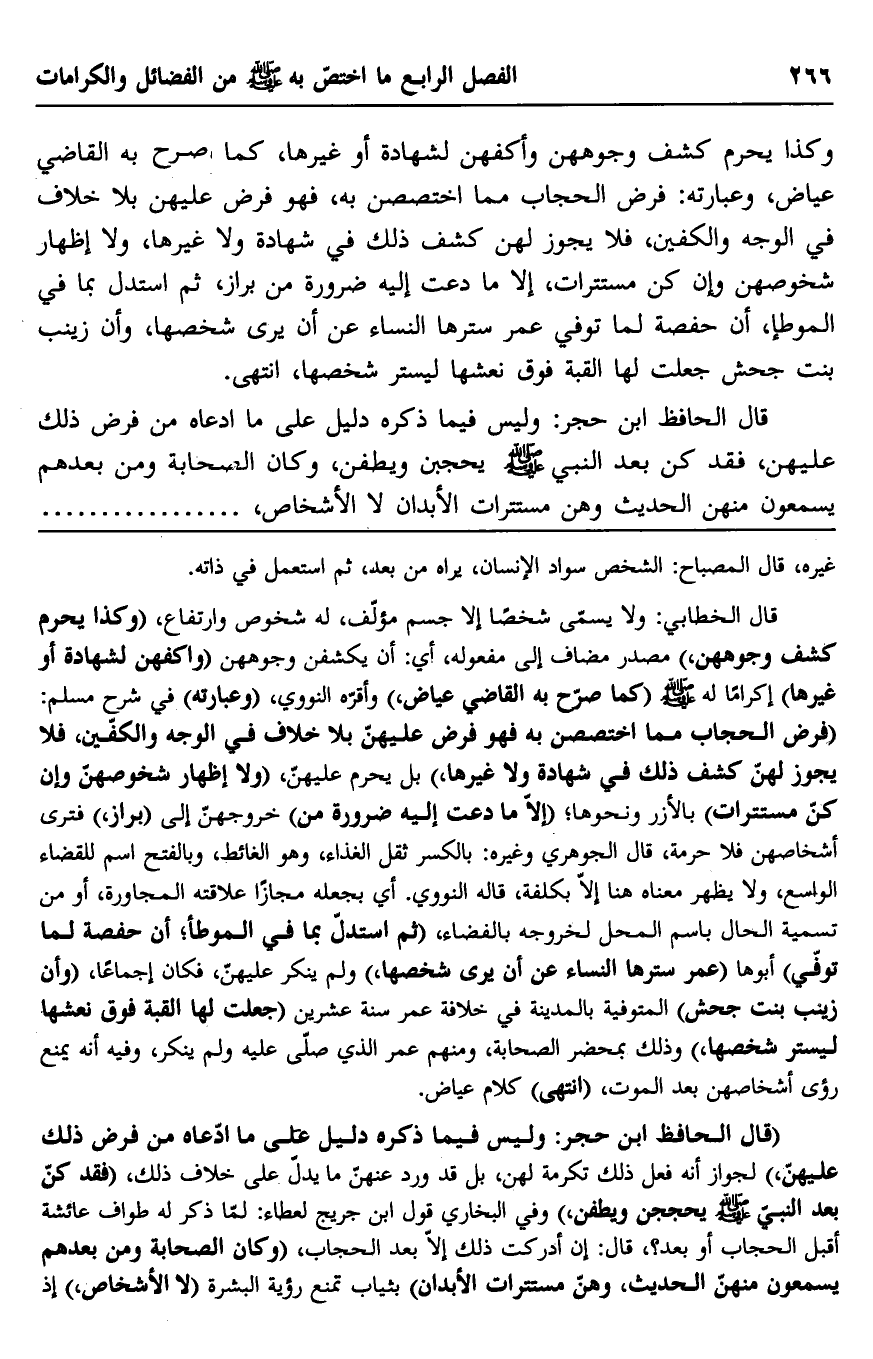 قال الحافظ ابن حجر: وليس فيما ذكره دليل على ما ادعاه من فرض ذلك عليهن، فقد كن بعد النبي صلى الله عليه وسلم يحجبن ويطفن، وكان الصحابة ومن بعدهم يسمعون منهن الحديث وهن مستترات الأبدان لا الأشخاص. انتهى.