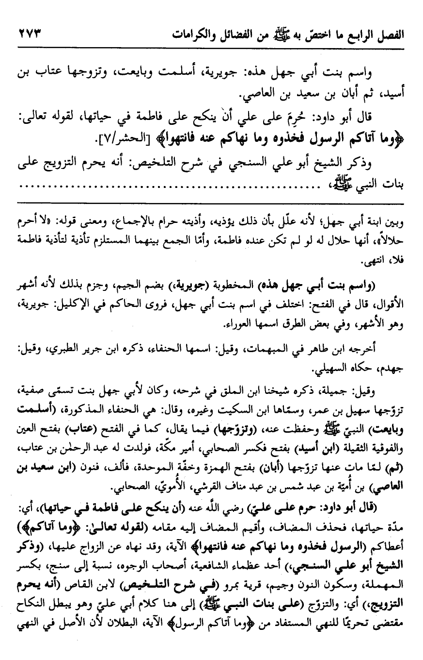 قال أبو داود: حرم على علي أن ينكح على فاطمة في حياتها، لقوله تعالى: {وَمَا آتَاكُمُ الرَّسُولُ فَخُذُوهُ وَمَا نَهَاكُمْ عَنْهُ فَانْتَهُوا} [الحشر: 7] .