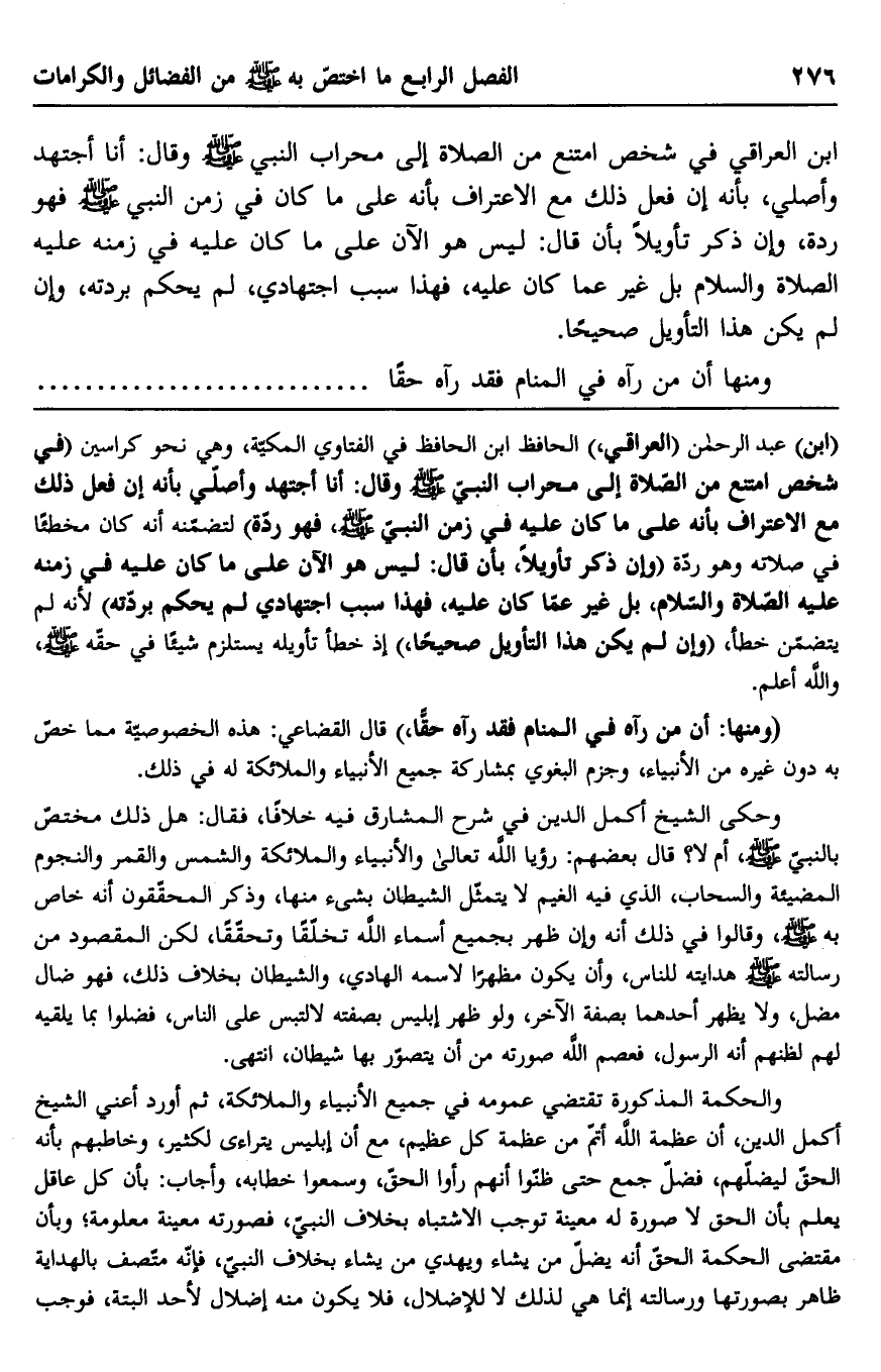 "ومنها: أن من رآه في المنام فقد رآه حقًا" قال القضاعي: هذه الخصوصية مما خص به دون غيره من الأنبياء، وجزم البغوي بمشاركة جميع الأنبياء والملائكة له في ذلك.