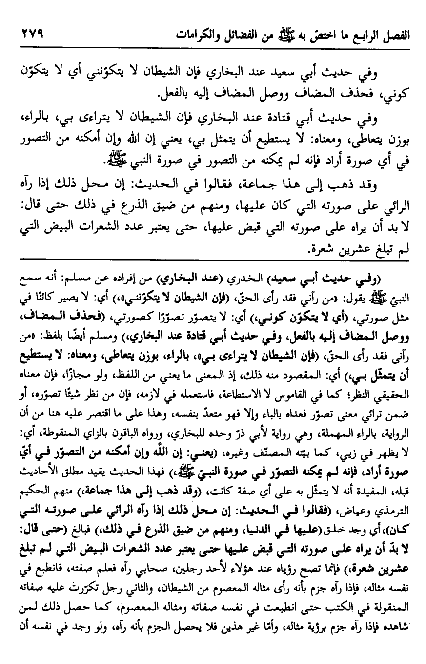 وفي حديث أبي قتادة عند البخاري: "فإن الشيطان لا يتراءى بي"، بالراء، بوزن يتعاطى، ومعناه: لا يستطيع أن يتمثل بي، يعني إن الله وإن أمكنه من التصور في أي صورة أراد فإنه لم يمكنه من التصور في صورة النبي صلى الله عليه وسلم.