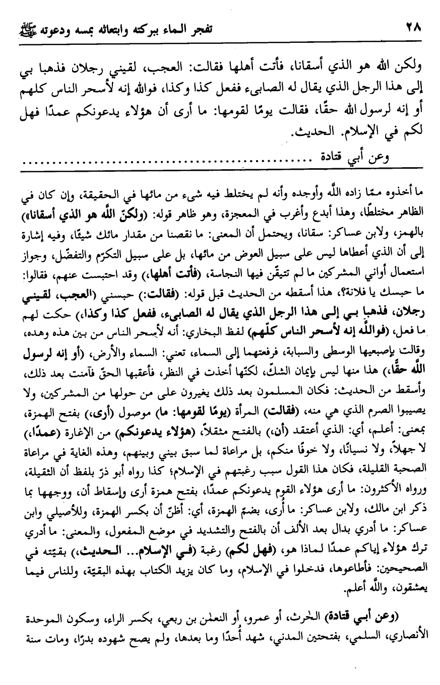 ولكن الله هو الذي أسقانا، فأتت أهلها فقالت: العجب، لقيني رجلان فذهبا بي إلى هذا الرجل الذي يقال له الصابئ ففعل كذا وكذا، فوالله إنه لأسحر الناس كلهم أو إنه لرسول الله حقًا، فقالت يومًا لقومها: ما أرى أن هؤلاء يدعونكم عمدًا فهل لكم في الإسلام. الحديث.