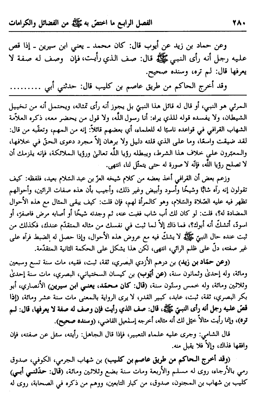 وعن حماد بن زيد عن أيوب قال: كان محمد -يعني ابن سيرين- إذا قص عليه رجل أنه رأى النبي صلى الله عليه وسلم قال: صف الذي رأيت، فإن وصف له صفة لا يعرفها قال: لم تره، وسنده صحيح.