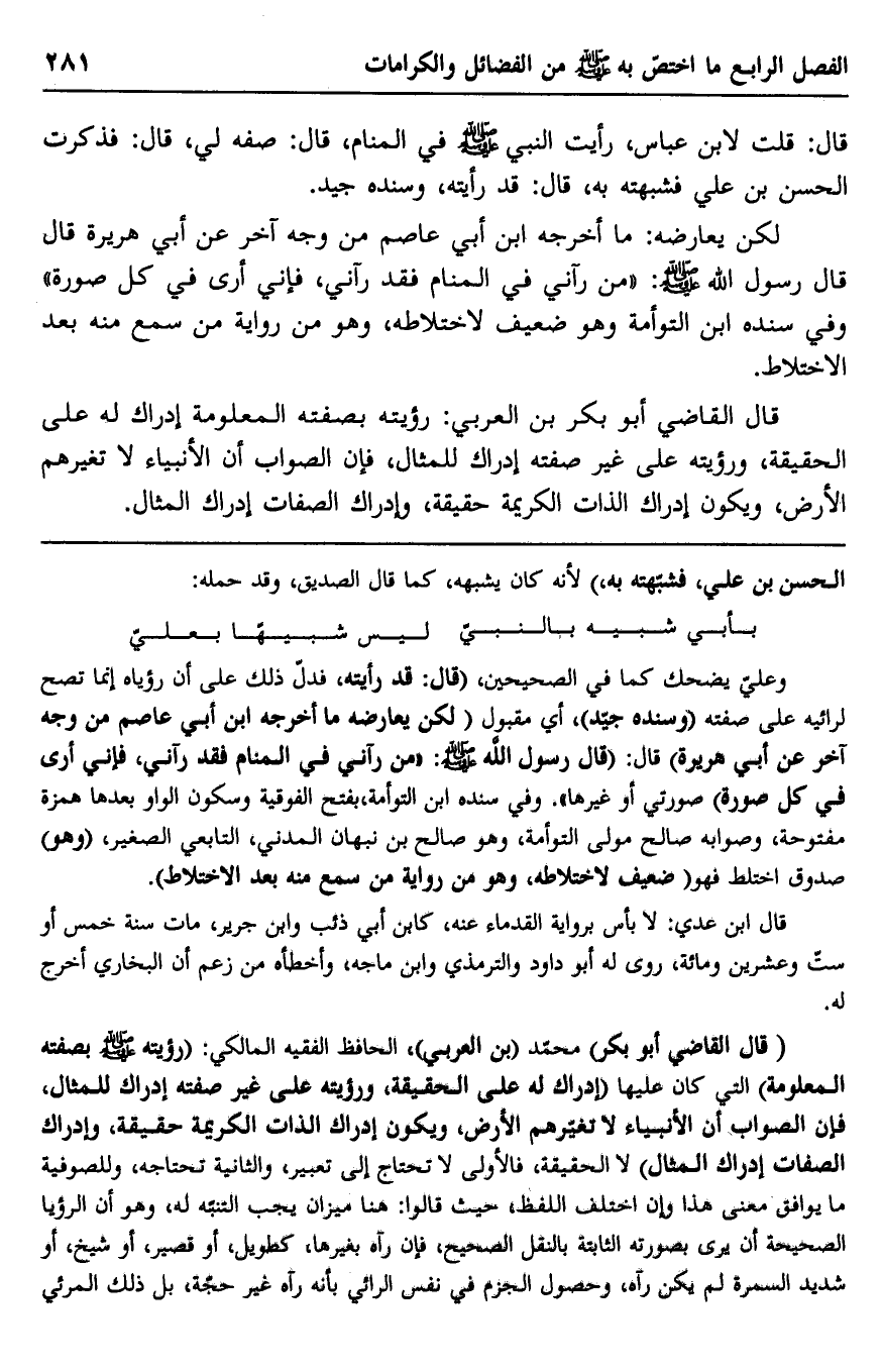 "قال القاضي أبو بكر" محمد "بن العربي" الحافظ الفقيه المالكي: "رؤيته صلى الله عليه وسلم بصفته المعلومة" التي كان عليها "إدراك له على الحقيقة، ورؤيته على غير صفته إدراك للمثال، فإن الصواب أن الأنبياء لا تغيرهم الأرض، ويكون إدراك الذات الكريمة حقيقة، وإدراك الصفات إدراك المثال" لا الحقيقة، فالأولى لا تحتاج إلى تعبير، والثانية تحتاجه، وللصوفية ما يوافق معنى هذا وإن اختلف اللفظ، حيث قالوا: هنا ميزان يجب التنبه به، وهو أن الرؤيا الصحيحة أن يرى بصورته الثابتة بالنقل الصحيح، فإن رآه بغيرها، كطويل، أو قصير، أو شيخ، أو شديد السمرة لم يكن رآه، وحصول الجزم في نفس الرائي بأنه رآه غير حجة، بل ذلك المرئي