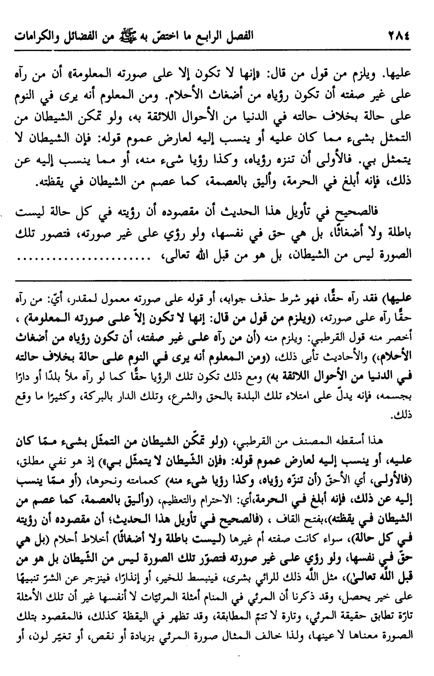 عليها. ويلزم من قول من قال: "إنها لا تكون إلا على صورته المعلومة" أن من رآه على غير صفته أن تكون رؤياه من أضغاث الأحلام. ومن المعلوم أنه يرى في النوم على حالة بخلاف حالته في الدينا من الأحوال اللائقة به، ولو تمكن الشيطان من التمثيل بشيء مما كان عليه أو ينسب إليه لعارض عموم قوله: فإن الشيطان لا يتمثل بي. فالأولى أن تنزه رؤياه، وكذا رؤيا شيء منه، أو مما ينسب إليه عن ذلك، فإنه أبلغ في الحرمة، وأليق بالعصمة، كما عصم من الشيطان في يقظته.