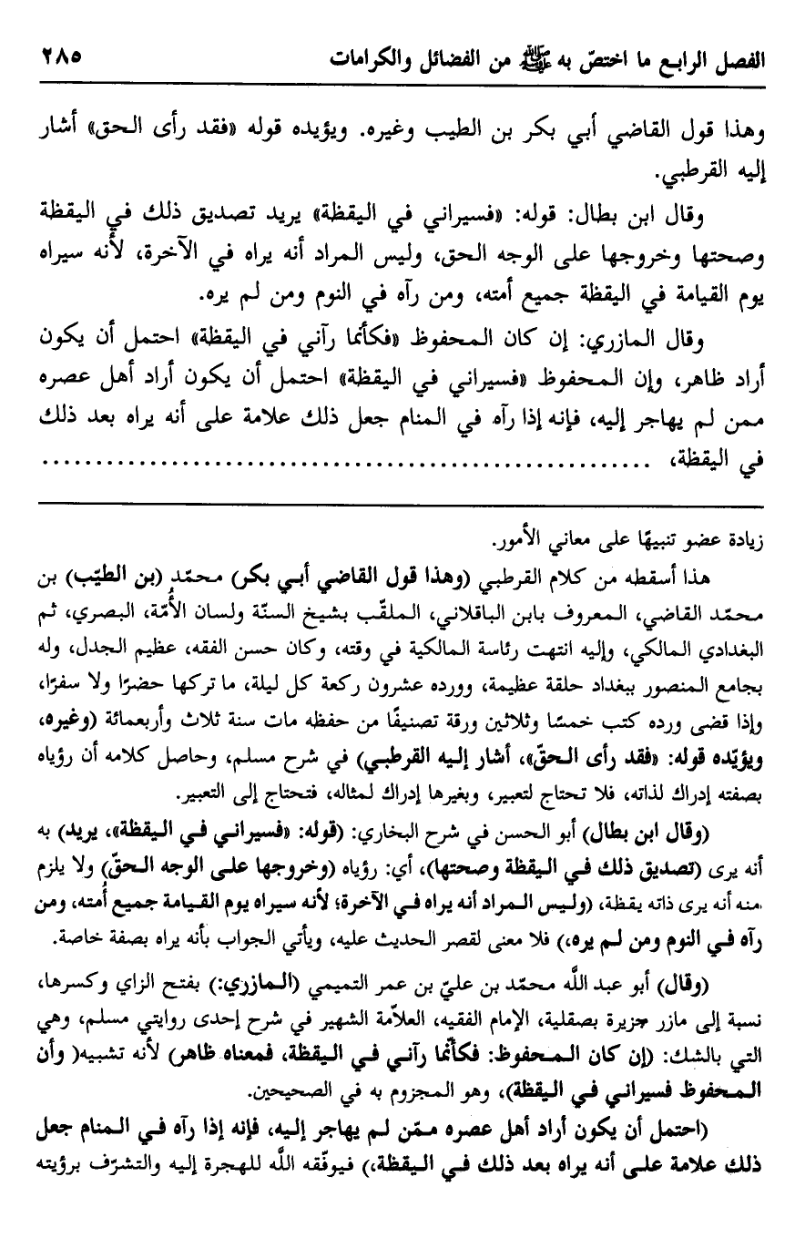 وقال المازري: إن كان المحفوظ "فكأنما رآني في اليقظة" احتمل أن يكون أراد عصره ممن لم يهاجر إليه، فإنه إذا رآه في المنام جعل ذلك علامة أن يراه بعد ذلك في اليقظة.