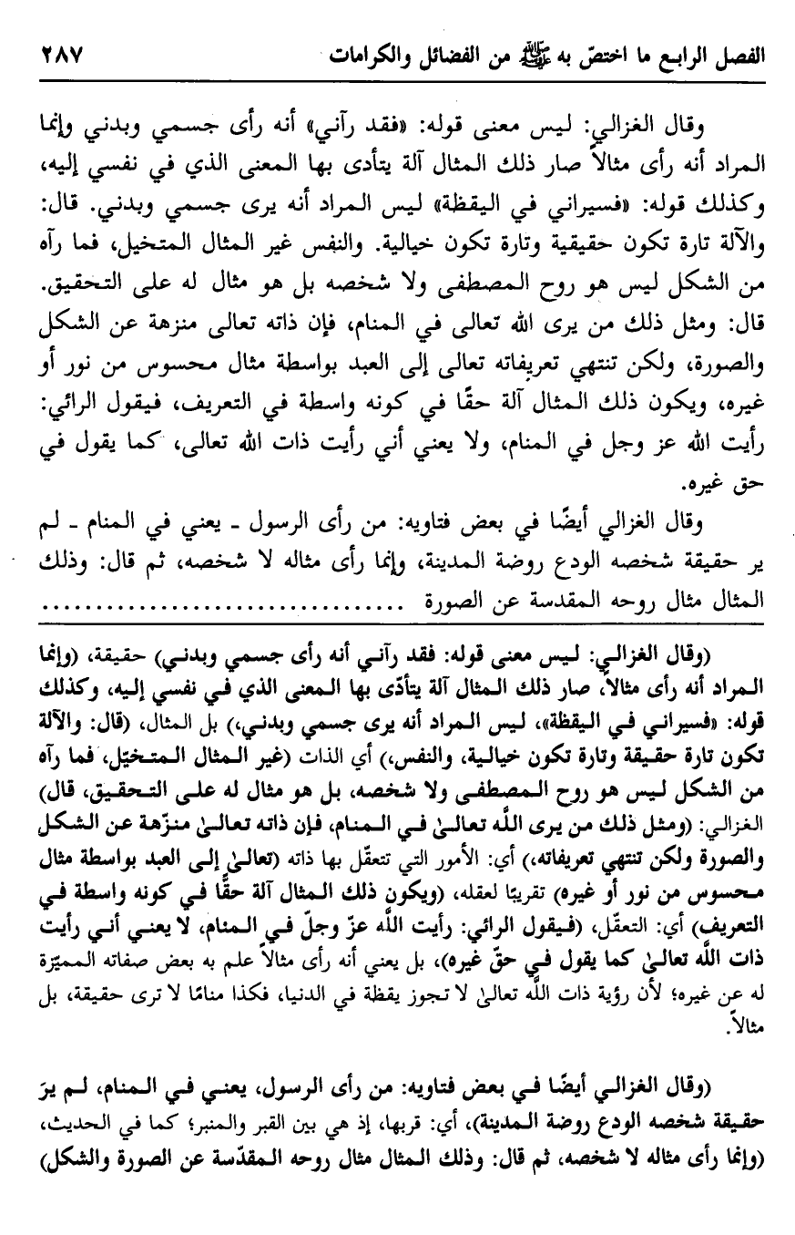 وقال الغزالي أيضًا في بعض فتاويه: من رأى الرسول -يعني في المنام- لم ير حقيقة شخصه الودع روضة المدينة، وإنما رأى مثاله لا شخصه، ثم قال: وذلك المثال مثال روحه المقدسة عن الصورة.