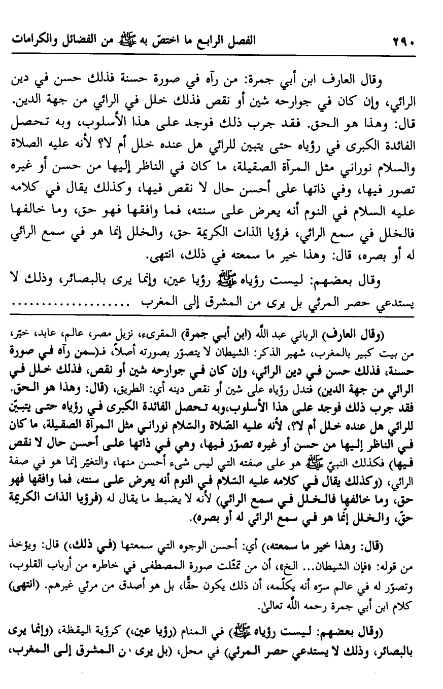 وقال العارف ابن أبي جمرة: من رآه في صورة حسنة فذلك حسن في دين الرائي، وإن كان في جوارحه شين أو نقص فذلك خلل في الرائي من جهة الدين. قال: وهذا هو الحق. فقد جرب ذلك فوجد على هذا الأسلوب، وبه تحصل الفائدة الكبرى في رؤياه حتى يتبين للرائي هل عنده خلل أم لا؟ لأنه عليه الصلاة والسلام نوراني مثل المرآة الصقيلة، ما كان في الناظر إليها من حسن أو غيره تصور فيها، وفي ذاتها على أحسن حال لا نقص فيها، وكذلك يقال في كلامه عليه السلام في النوم أنه يعرض على سنته، فما وافقها فهو حق، وما خالفها فالخلل في سمع الرائي، فرؤيا الذات الكريمة حق، والخلل إنما هو في سمع الرائي له أو بصره، قال: وهذا خير ما سمعته في ذلك، انتهى.