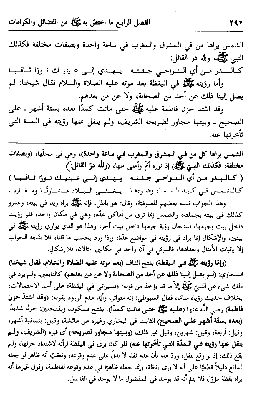 الشمس يراها من في المشرق والمغرب في ساعة واحد"، وهي في محلها، "وبصفات مختلفة فكذلك النبي صلى الله عليه وسلم" إذ نوره أتم وأعلى منها، "ولله در القائل"