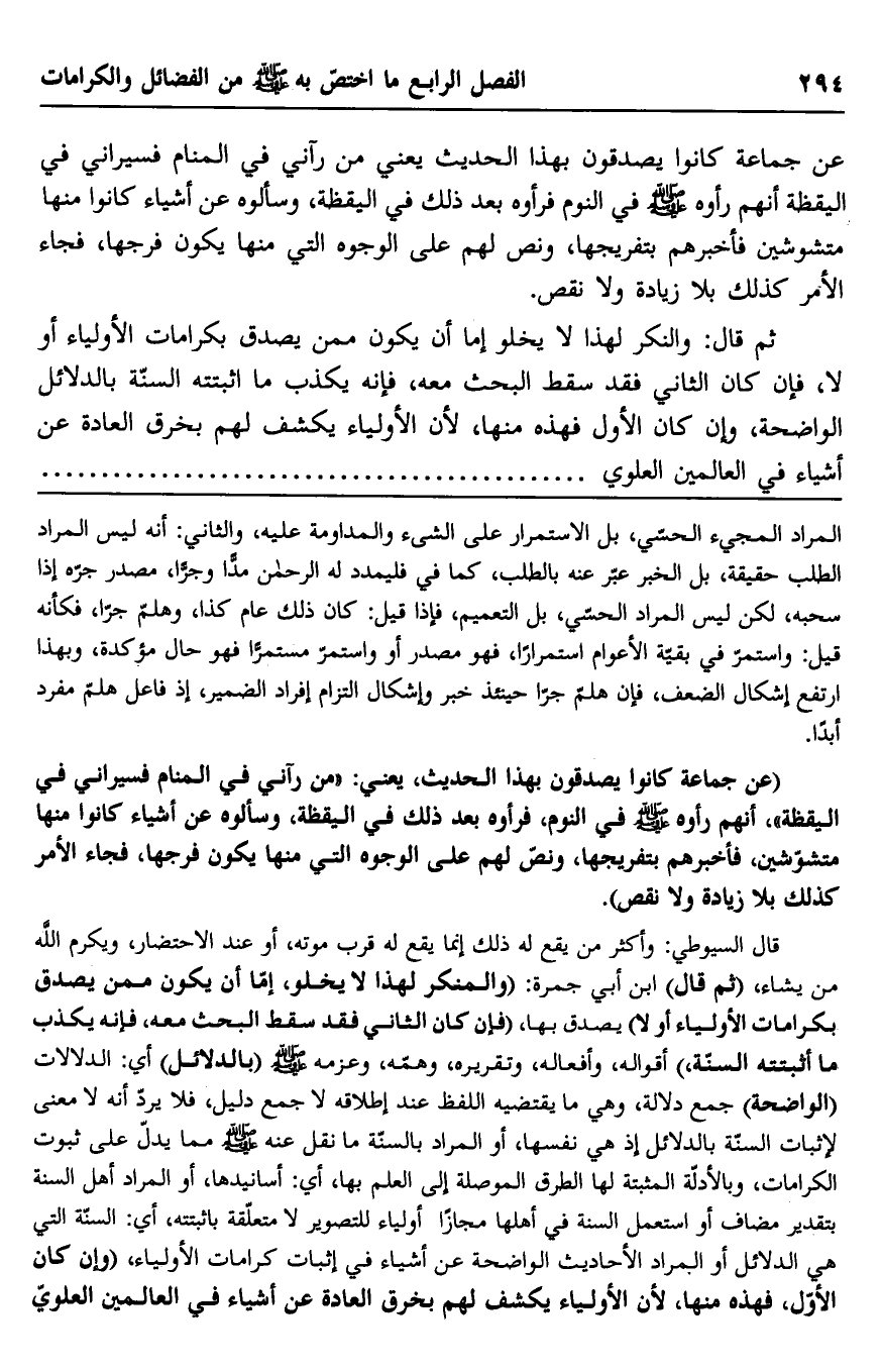 قال السيوطي: وأكثر من يقع له ذلك إنما يقع له قرب موته، أو عند الاحتضار، ويكرم الله من يشاء، "ثم قال" ابن أبي جمرة: "والمنكر لهذا لا يخلو، إما أن يكون ممن يصدق بكرامات الأولياء أو لا" يصدق بها، "فإن كان الثاني فقد سقط البحث معه، فإنه يكذب ما أثبتته السنة" أقواله، وأفعاله، وتقريره، وهممه، وعزمه صلى الله عليه وسلم "بالدلائل" أي: الدلالات "الواضحة" جمع دلالة، وهي ما يقتضيه اللفظ عند إطلاقه لا جمع دليل، فلا يرد أنه لا معنى فثبات السنة بالدلائل إذ هي نفسها، أو المراد بالسنة ما نقل عنه صلى الله عليه وسلم مما يدل على ثبوت الكرامات، وبالأدلة المثبتة لها الطرق الموصلة إلى العلم بها، أي: أسانيدها، أو المراد أهل السنة بتقدير مضاف أو استعمل السنة في أهلها مجازًا أولياء للتصوير لا متعلقة بأثبتته، أي: السنة التي هي الدلائل أو المراد الأحاديث الواضحة عن أشياء في إثبات كرامات الأولياء، "وإن كان الأول فهذه منها, لأن الأولياء يكشف لهم بخرق العادة عن أشياء في العالمين العلوي