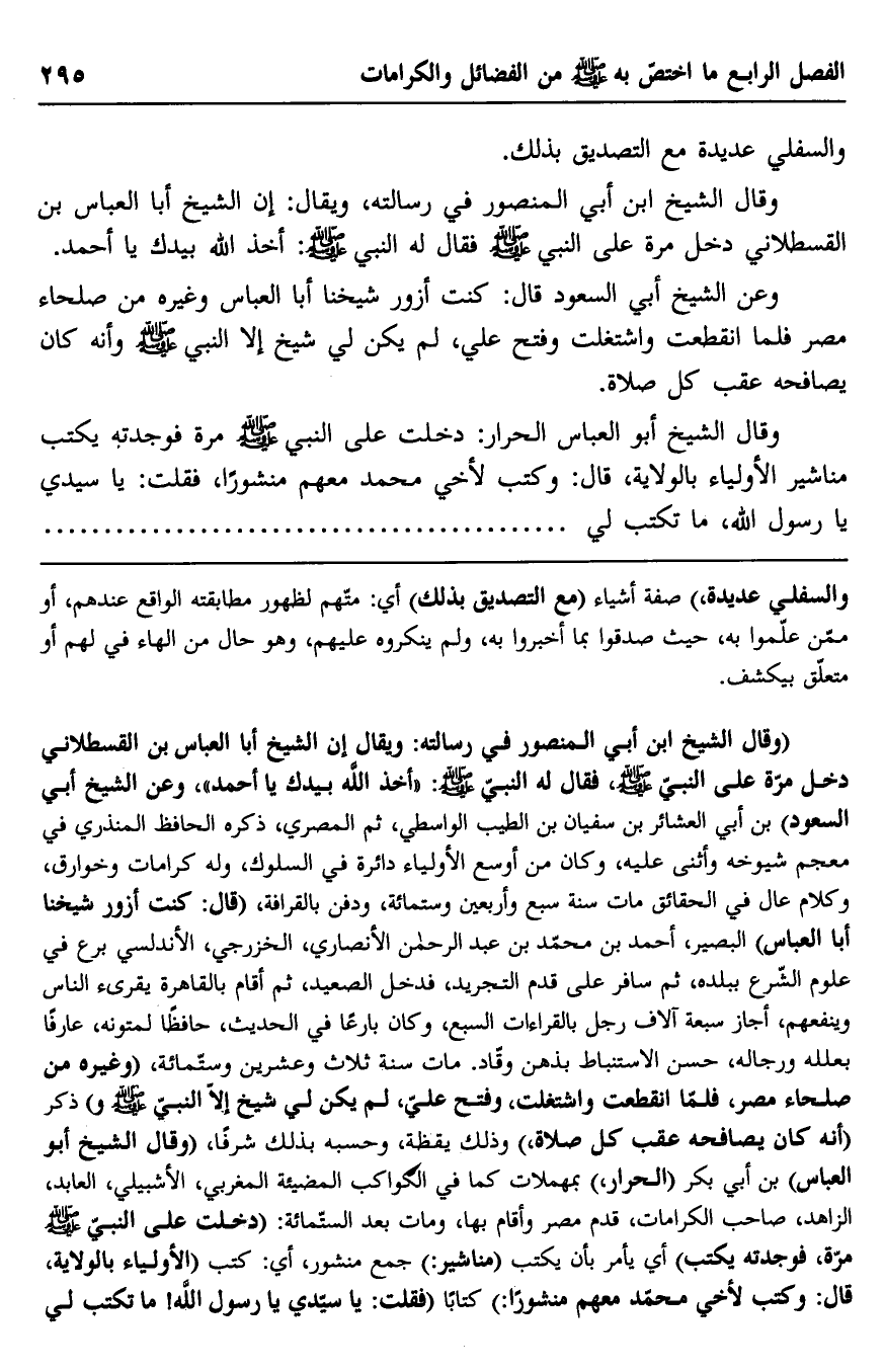 وقال الشيخ ابن أبي المنصور في رسالته، ويقال: إن الشيخ أبا العباس بن القسطلاني دخل مرة على النبي صلى الله عليه وسلم فقال له النبي صلى الله عليه وسلم: أخذ الله بيدك يا أحمد.