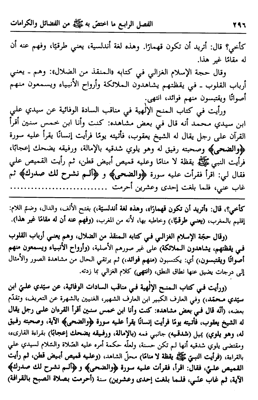 ورأيت في كتاب المنح الإلهية في مناقب السادة الوفائية عن سيدي علي ابن سيدي محمد أنه قال في بعض مشاهده: كنت وأنا ابن خمس سنين أقرأ القرآن على رجل يقال له الشيخ يعقوب، فأتيته يومًا فرأيت إنسانًا يقرأ عليه سورة {وَالضُّحَى} وصحبته رفيق له وهو يلوي شدقيه بالإمالة، ورفيقه يضحك إعجابًا، فرأيت النبي صلى الله عليه وسلم يقظة لا منامًا وعليه قميص أبيض قطن، ثم رأيت القميص علي فقال لي: اقرأ فقرأت عليه سورة {وَالضُّحَى} و {أَلَمْ نَشْرَحْ لَكَ صَدْرَكَ} ثم غاب عني، فلما بلغت إحدى وعشرين أحرمت.