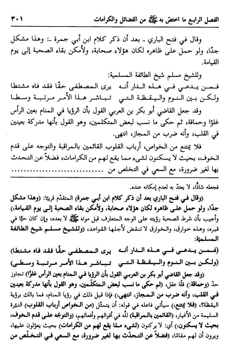 "وقال في فتح الباري بعد أن ذكر كلام ابن أبي جمرة" المتقدم قريبًا: "وهذا مشكل جدًا، ولو حمل على ظاهره لكان هؤلاء صحابة، ولأمكن بقاء الصحبة إلى يوم القيامة" وأجيب بأن شرط الصحبة رؤيته على الوجه المتعارف قبل موته صلى الله عليه وسلم لا بعده، وإن كان حيًا في قبره، وهذه خوارق، والخوارق لا تنقض لأجلها القواعد، "وللشيخ مسلم شيخ الطائفة المسلمية:
