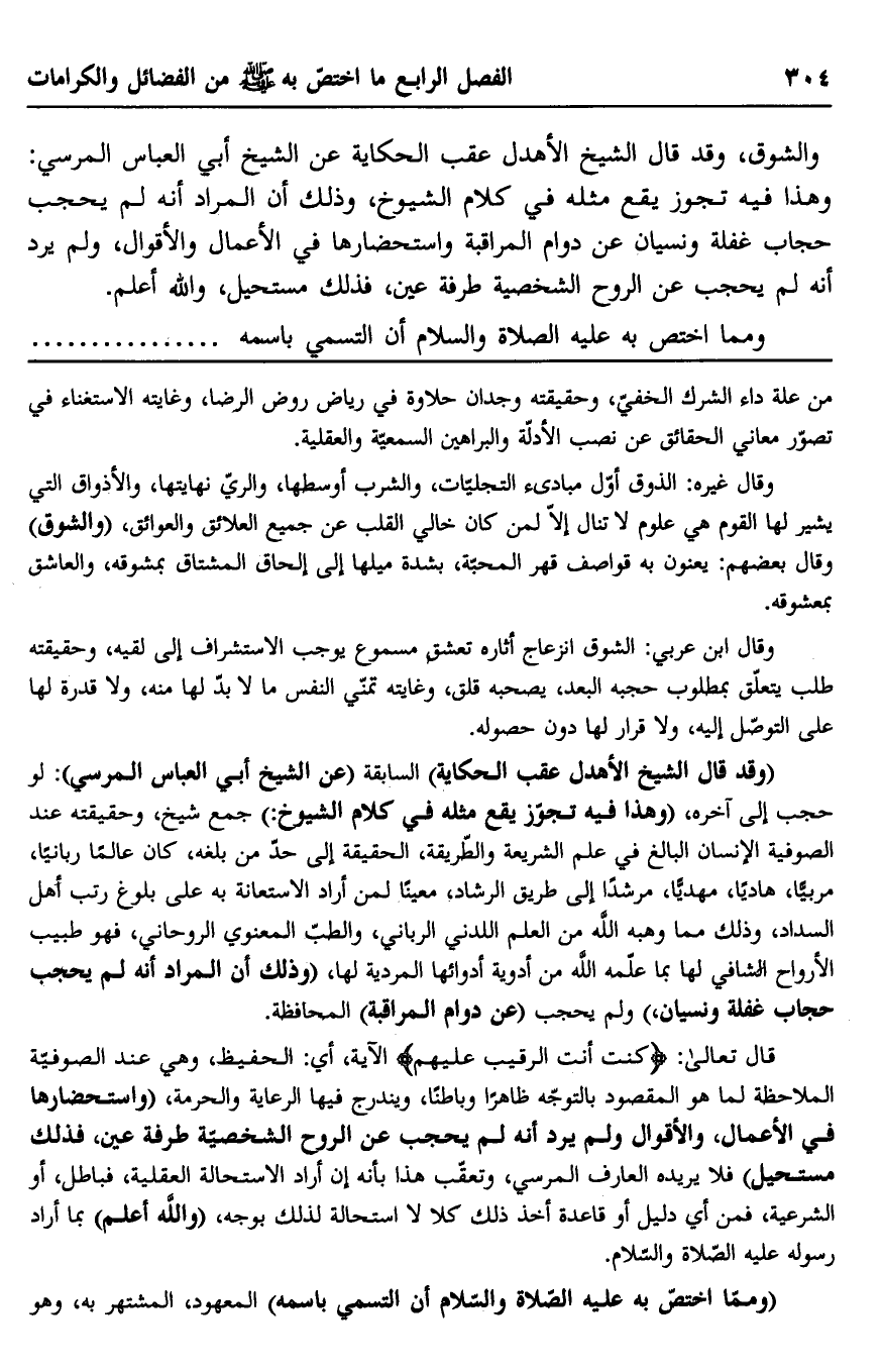 والشوق، وقد قال الشيخ الأهدل عقب الحكاية عن الشيخ أبي العباس المرسي: وهذا فيه تجوز يقع مثله في كلام الشيوخ، وذلك أن المراد أنه لم يحجب حجاب غفلة ونسيان عن دوام المراقبة واستحضارها في الأعمال والأقوال، ولم يرد أنه لم يحجب عن الروح الشخصية طرفة عين، فذلك مستحيل، والله أعلم.
