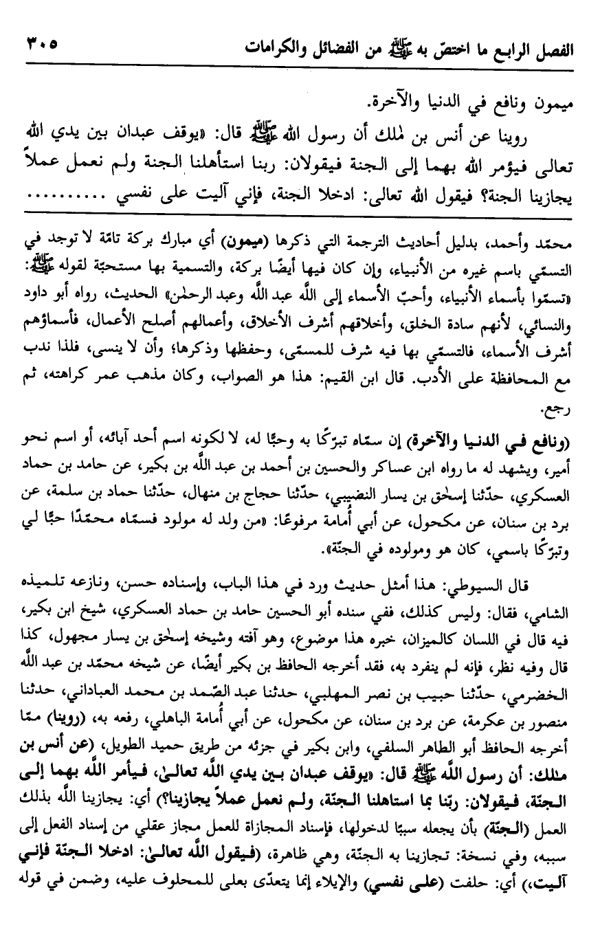 "ونافع في الدنيا والآخرة" إن سماه تبركًا به وحبًا له، لا لكونه اسم أحد آبائه، أو اسم نحو أمير، ويشهد له ما رواه ابن عساكر والحسين بن أحمد بن عبد الله بن بكير، عن حامد بن حماد العسكري، حدثنا إسحاق بن يسار النضيبي، حدثنا حجاج بن منهال، حدثنا حماد بن سلمة، عن برد بن سنان، عن مكحول، عن أبي أمامة مرفوعًا: "من ولد له مولود فسماه محمدًا حبًا لي وتبركًا باسمي، كان هو ومولوده في الجنة".