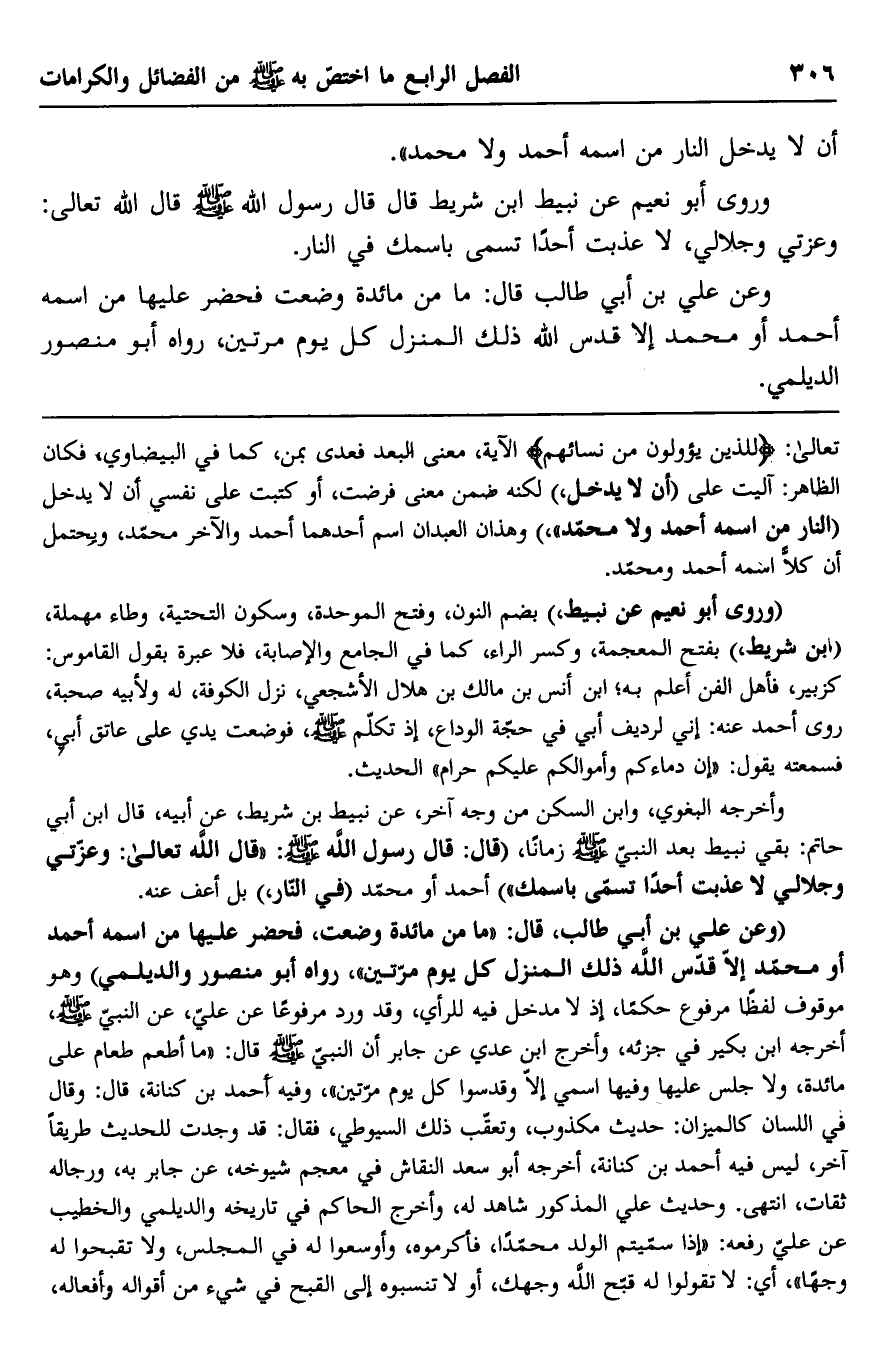 وأخرجه البغوي، وابن السكن من وجه آخر، عن نبيط بن شريط، عن أبيه، قال ابن أبي حاتم: بقي نبيط بعد النبي صلى الله عليه وسلم زمانًا، "قال: قال رسول الله صلى الله عليه وسلم: "قال الله تعالى: وعزتي وجلالي لا عذبت أحدًا تسمى باسمك" أحمد أو محمد "في النار" بل أعفو عنه.
