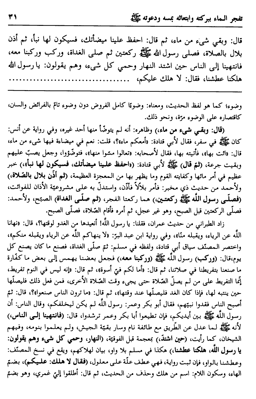 قال: وبقي شيء من ماء، ثم قال: "احفظ علينا ميضأتك"، فسيكون لها نبأ، ثم أذن بلال بالصلاة، فصلى رسول الله صلى الله عليه وسلم ركعتين ثم صلى الغداة، وركب وركبنا معه، فانتهينا إلى الناس حين اشتد النهار وحمي كل شيء، وهم يقولون: يا رسول الله هلكنا عطشنا، فقال: "لا هلك عليكم"