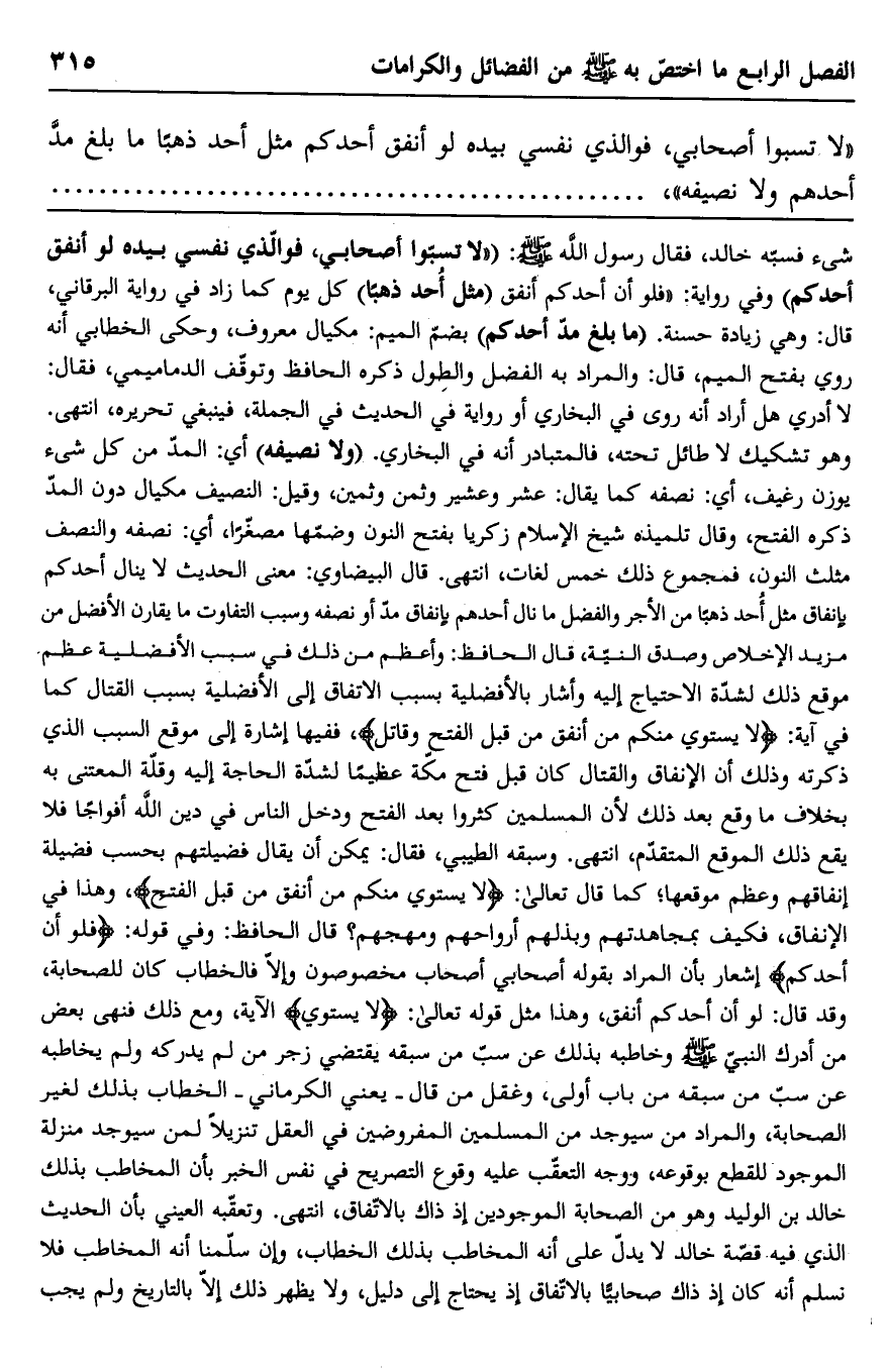 .وثمين، وقيل: النصيف مكيال دون المد ذكره الفتح، وقال تلميذه شيخ الإسلام زكريا بفتح النون وضمها مصغرًا، أي: نصفه والنصف مثلث النون، فمجموع ذلك خمس لغات، انتهى. قال البيضاوي: معنى الحديث لا ينال أحدكم بإنفاق مثل أحد ذهبًا من الأجر والفضل ما نال أحدهم بإنفاق مد أو نصفه وسبب التفاوت ما يقارن الأفضل من مزيد الإخلاص وصدق النية، قال الحافظ: وأعظم من ذلك في سبب الأفضلية عظم موقع ذلك لشدة الاحتياج إليه وأشار بالأفضلية بسبب الاتفاق إلى الأفضلية بسبب القتال كما في آية: {لَا يَسْتَوِي مِنْكُمْ مَنْ أَنْفَقَ مِنْ قَبْلِ الْفَتْحِ وَقَاتَلَ} ، ففيها إشارة إلى موقع السبب الذي ذكرته وذلك أن الإنفاق والقتال كان قبل فتح مكة عظيمًا لشدة الحاجة إليه وقلة المعتنى به بخلاف ما وقع بعد ذلك لأن المسلمين كثروا بعد الفتح ودخل الناس في دين الله أفواجًا فلا يقع ذلك الموقع المتقدم، انتهى. وسبقه الطيبي، فقال: يمكن أن يقال فضيلتهم بحسب فضيلة إنفاقهم وعظم موقعها؛ كما قال تعالى: {لَا يَسْتَوِي مِنْكُمْ مَنْ أَنْفَقَ مِنْ قَبْلِ الْفَتْحِ} ، وهذا في الإنفاق، فكيف بمجاهدتهم وبذلهم أرواحهم ومهجهم؟ قال الحافظ: وفي قوله: "فلو أن أحدكم" إشعار بأن المراد بقوله أصحابي أصحاب مخصصون وإلا فالخطاب كان للصحابة، وقد قال: لو أن أحدكم أنفق، وهذا مثل قوله تعالى: {لَا يَسْتَوِي} الآية، ومع ذلك فنهي بعض من أدرك النبي صلى الله عليه وسلم وخاطبه بذلك عن سب من سبقه يقتضي زجر من لم يدركه ولم يخاطبه عن سب من سبقه من باب أولى، وغفل من قال -يعني الكرماني- الخطاب بذلك لغير الصحابة، والمراد من سيوجد من المسلمين المفروضين في العقل تنزيلا لمن سيوجد منزلة الموجود للقطع بوقوعه، ووجه التعقب عليه وقوع التصريح في نفس الخبر بأن المخاطب بذلك خالد بن الوليد وهو من الصحابة الموجودين إذ ذاك بالاتفاق، انتهى. وتعقبه العيني بأن الحديث الذي فيه قصة خالد لا يدل على أنه المخاطب بذلك الخطاب، وإن سلمنا أنه المخاطب فلا نسلم أنه كان إذ ذاك صحابيًا بالاتفاق إذ يحتاج إلى دليل، ولا يظهر ذلك إلا بالتاريخ ولم يجب