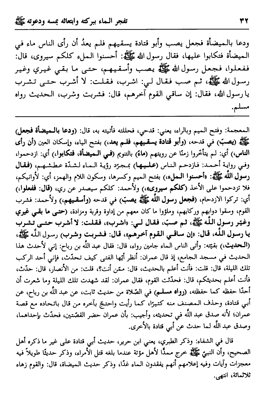 قال في الشفاء: وذكر الطبري، يعني ابن جرير، حديث أبي قتادة على غير ما ذكره أهل الصحيح، وأن النبي صلى الله عليه وسلم خرج ممدًا لأهل مؤتة عندما بلغه قتل الأمراء، وذكر حديثًا طويلا فيه معجزات وآيات وفيه إعلامهم أنهم يفقدون الماء غدًا، وذكر حديث الميضأة، قال: والقوم زهاء ثلاثمائة، انتهى.