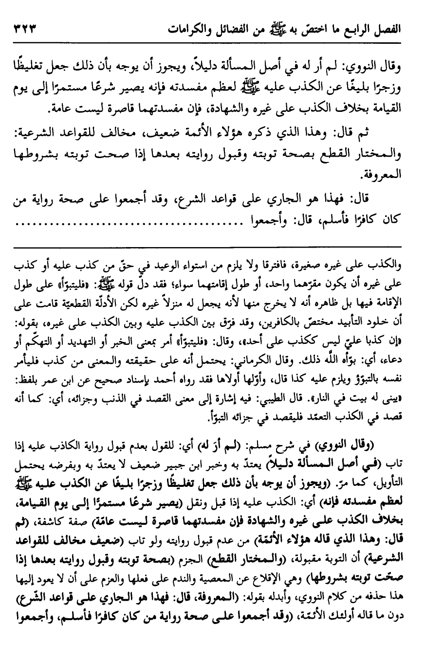 وقال النووي: لم أر له في أصل المسألة دليلا، ويجوز أن يوجه بأن ذلك جعل تغليظًا وزجرًا بليغًا عن الكذب عليه صلى الله عليه وسلم لعظم مفسدته فإنه يصير شرعًا مستمرًا إلى يوم القيامة بخلاف الكذب على غيره والشهادة، فإن مفسدتهما قاصرة ليست عامة.