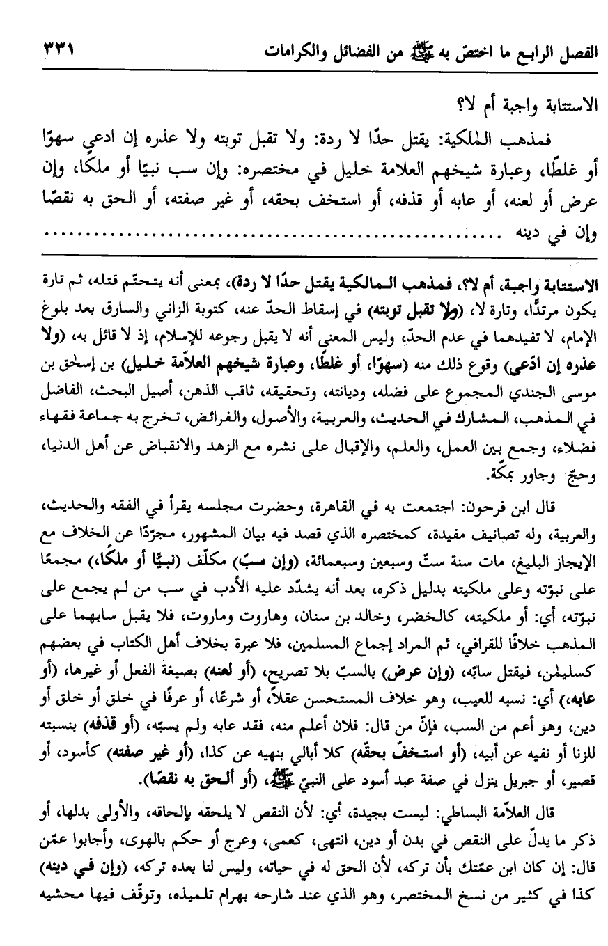 الاستتابة واجبة، أم لا؟ فمذهب المالكية يقتل حدًا لا ردة" بمعنى أنه يتحتم قتله، ثم تارة يكون مرتدًا، وتارة لا، "ولا تقبل توبته" في إسقاط الحد منه، كتوبة الزاني والسارق بعد بلوغ الإمام، لا تفيدهما في عدم الحد، وليس المعنى أنه لا يقبل رجوعه للإسلام، إذ لا قائل به، "ولا عذره إن ادعى" وقوع ذلك منه "سهوًا أو غلطًا، وعبارة شيخهم العلامة خليل" بن إسحاق بن موسى الجندي المجموع على فضله، وديانته، وتحقيقه، ثاقب الذهن، أصيل البحث، الفاضل في المذهب، المشارك في الحديث، والعربية، والأصول، والفرائض، تخرج به جماعة فقهاء فضلاء، وجمع بين العمل، والعلم، والإقبال على نشره مع الزهد والانقباض عن أهل الدنيا، وحج وجاور بمكة.
