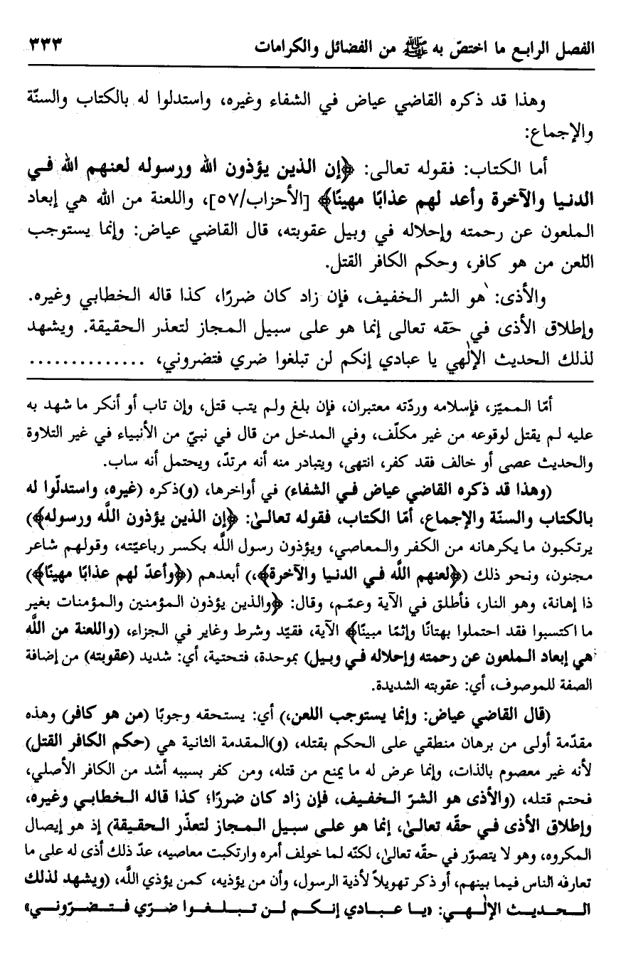 أما الكتاب: فقوله تعالى: {إِنَّ الَّذِينَ يُؤْذُونَ اللَّهَ وَرَسُولَهُ لَعَنَهُمُ اللَّهُ فِي الدُّنْيَا وَالْآخِرَةِ وَأَعَدَّ لَهُمْ عَذَابًا مُهِينًا} [الأحزاب: 57] ، واللعنة من الله هي إبعاد الملعون عن رحمته وإحلاله في وبيل عقوبته، قال القاضي عياض: وإنما يستوجب اللعن من هو كافر، وحكم الكافر القتل.
