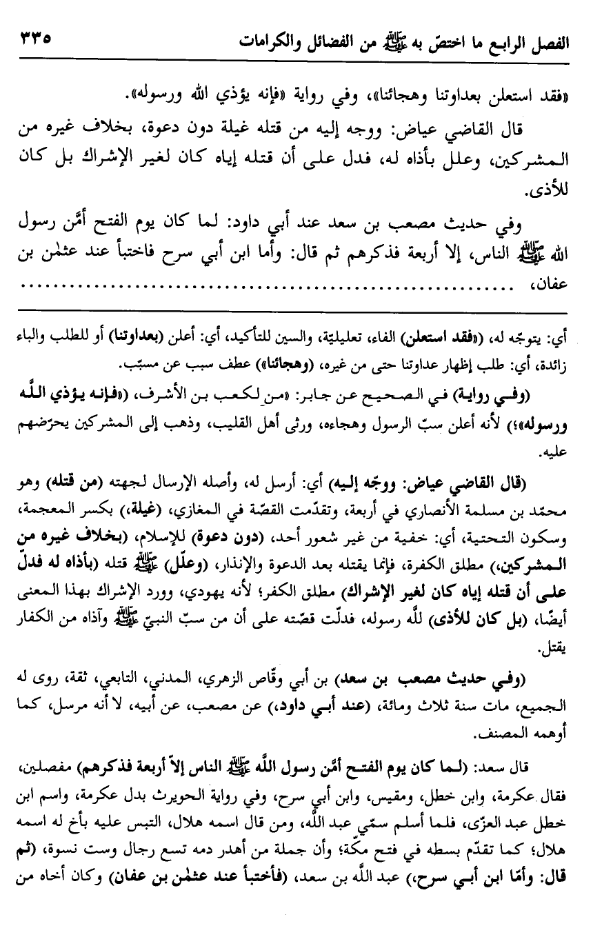 "قال القاضي عياض: ووجه إليه" أي: أرسل له، وأصله الإرسال لجهته "من قتله" وهو محمد بن مسلمة الأنصاري في أربعة، وتقدمت القصة في المغازي، "غيلة" بكسر المعجمة، وسكون التحتية، أي: خفية من غير شعور أحد، "دون دعوة" للإسلام، "بخلاف غيره من المشركين" مطلق الكفرة، فإنما يقتله بعد الدعوة والإنذار، "وعلل" صلى الله عليه وسلم قتله "بأذاه له فدل على أن قتله إياه كان لغير الإشراك" مطلق الكفر؛ لأنه يهودي، وورد الإشراك بهذا المعنى أيضًا، "بل كان للأذى" لله ورسوله، فدلت قصته على أن من سب النبي صلى الله عليه وسلم وآذاه من الكفار يقتل.