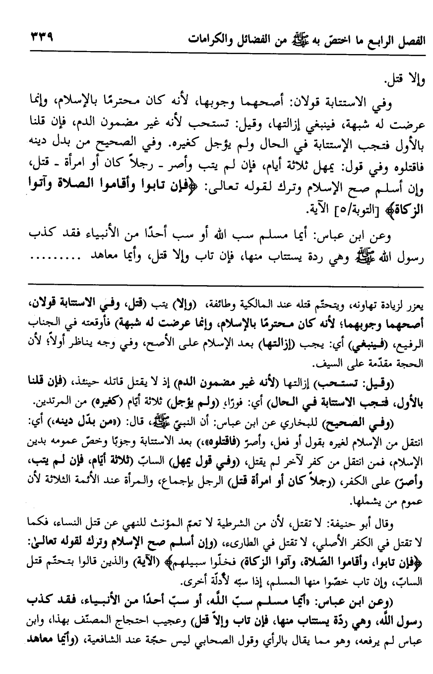 "وفي الصحيح" للبخاري عن ابن عباس: أن النبي صلى الله عليه وسلم، قال: "من بدل دينه" أي: انتقل من الإسلام لغيره بقول أو فعل، وأصر "فاقتلوه" بعد الاستتابة وجوبًا وخص عمومه بدين الإسلام، فمن انتقل من كفر لآخر لم يقتل، "وفي قول يمهل" الساب "ثلاثة أيام، فإن لم يتب، وأصر" على الكفر، "رجلا كان أو امرأة قتل" الرجل بإجماع، والمرأة عند الأئمة الثلاثة لأن عموم من يشملها.
