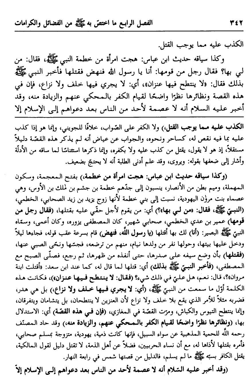 وكذا سياقه حديث ابن عباس: هجت امرأة من خطمة النبي صلى الله عليه وسلم، فقال: "من لي بها"؟ 0 فقال رجل من فوقها: أنا يا رسول الله فنهض فقتلها فأخبر النبي صلى الله عليه وسلم بذلك فقال: "لا ينتطح فيها عنزان"، أي: لا يجري فيها خلف ولا نزاع، فإن في هذه القصة ونظائرها نظرًا واضحًا لقيام الكفر بالمحكي عنهم والزيادة منه، وقد أخبر عليه السلام أنه لا عصمة لأحد من الناس بعد دعواهم إلى الإسلام إلا