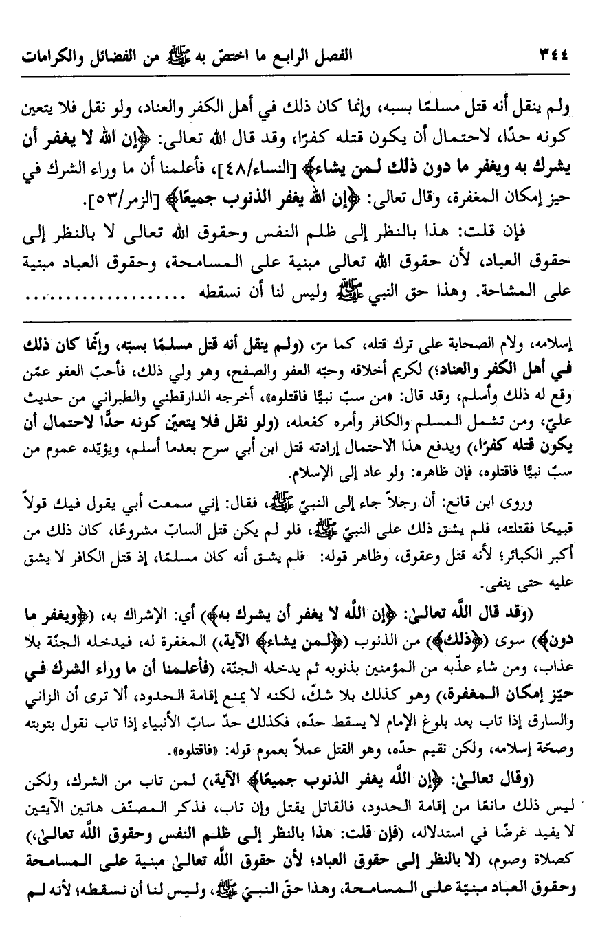 "وقد قال الله تعالى: {إِنَّ اللَّهَ لَا يَغْفِرُ أَنْ يُشْرَكَ بِهِ} أي: الإشراك به، {وَيَغْفِرُ مَا دُونَ} سوى {ذَلِكَ} من الذنوب {لِمَنْ يَشَاءُ} الآية المغفرة له، فيدخله الجنة بلا عذاب، ومن شاء عذبه من المؤمنين بذنوبه ثم يدخله الجنة، "فأعلمنا أن ما وراء الشرك في حيز إمكان المغفرة" وهو كذلك بلا شك، لكنه لا يمنع إقامة الحدود، ألا ترى أن الزاني والسارق إذا تاب بعد بلوغ الإمام لا يسقط حده، فكذلك حد ساب الأنبياء إذا تاب نقول بتوبته وصحة إسلامه، ولكن نقيم حده، وهو القتل عملا بعموم قوله: "فاقتلوه".