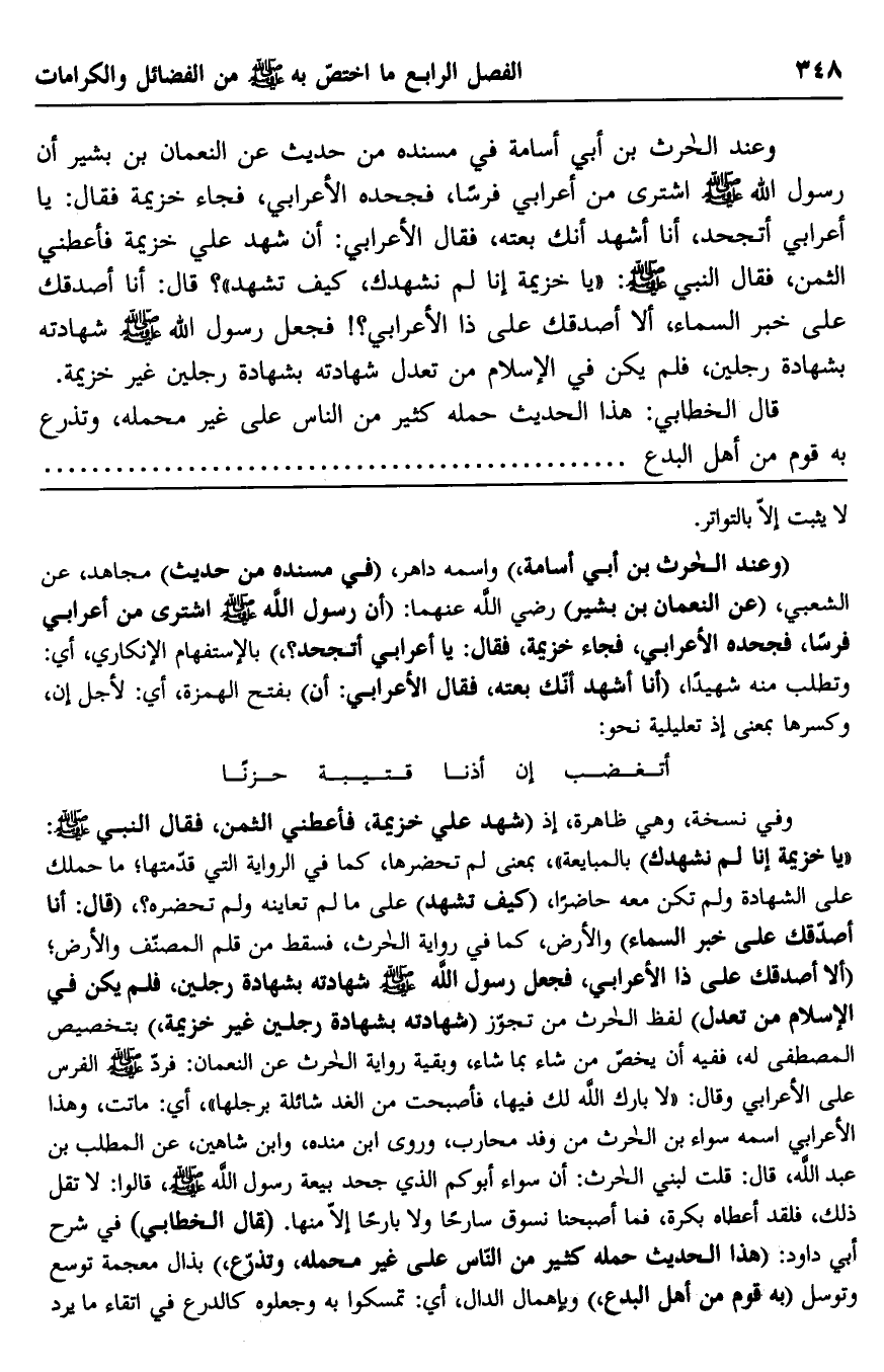رجلين، فلم يكن في الإسلام من تعدل" لفظ الحارث من تجوز "شهادته بشهادة رجلين غير خزيمة"، بتخصيص المصطفى له، ففيه أن يخص من شاء بما شاء، وبقية رواية الحارث عن النعمان: فرد صلى الله عليه وسلم الفرس على الأعرابي وقال: "لا بارك الله لك فيها، فأصبحت من الغد شائلة برجلها" أي: ماتت، وهذا الأعرابي اسمه سواء بن الحارث من وفد محارب، وروى ابن منده، وابن شاهين، عن المطلب بن عبد الله، قال: قلت لبني الحارث: إن سواء أبوكم الذي جحد بيعة رسول الله صلى الله عليه وسلم، قالوا: لا تقل ذلك، فلقد أعطاه بكرة، فما أصبحنا نسوق سارحًا ولا بارحًا إلا منها. "قال الخطابي" في شرح أبي داود: "هذا الحديث حمله كثير من الناس على غير محمله، وتذرع" بذال معجمة توسع وتوسل "به قوم من أهل البدع" وبإهمال الدال، أي: تمسكوا به وجعلوه كالدرع في اتقاء ما يرد