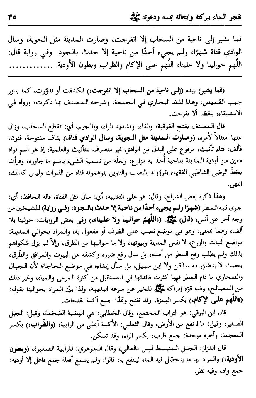 فما يشير ئإلى ناحية من السحاب إلا انفرجت، وصارت المدينة مثل الجوبة، وسال الوادي قناة شهرًا، ولم يجئ أحد من ناحية إلا حدث بالجود. وفي رواية قال: "اللهم حوالينا ولا علينا، اللهم على الإكام والظراب وبطون الأودية,