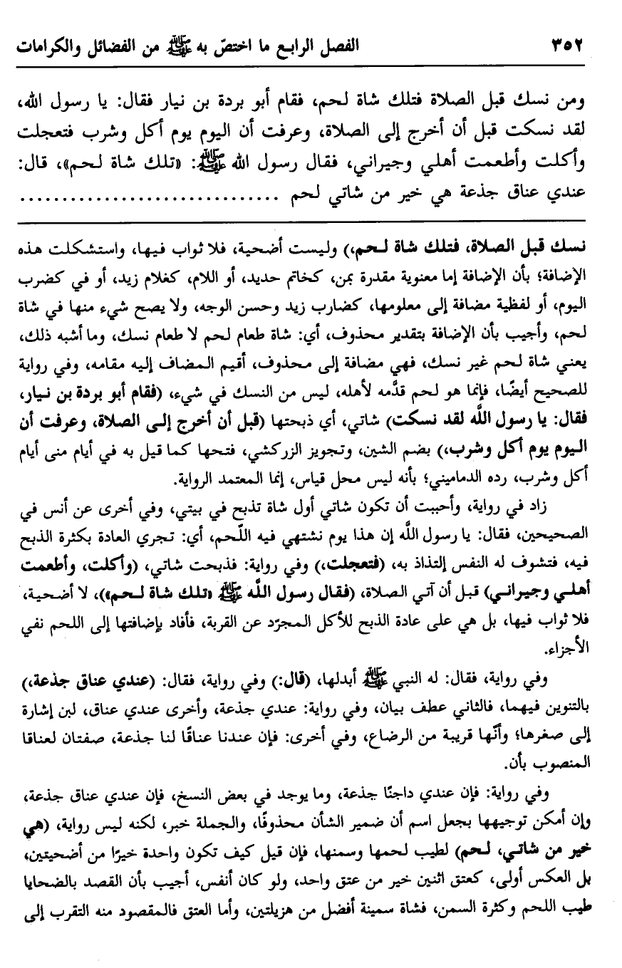 ومن نسك قبل الصلاة فتلك شاة لحم، فقام أبو بردة بن نيار فقال: يا رسول الله، لقد نسكت قبل أن أخرج إلى الصلاة، وعرفت أن اليوم يوم أكل وشرب فتعجلت وأكلت وأطعمت أهلي وجيراني، فقال رسول الله صلى الله عليه وسلم: "تلك شاة لحم"، قال: عندي عناق جذعة هي خير من شاتي لحم