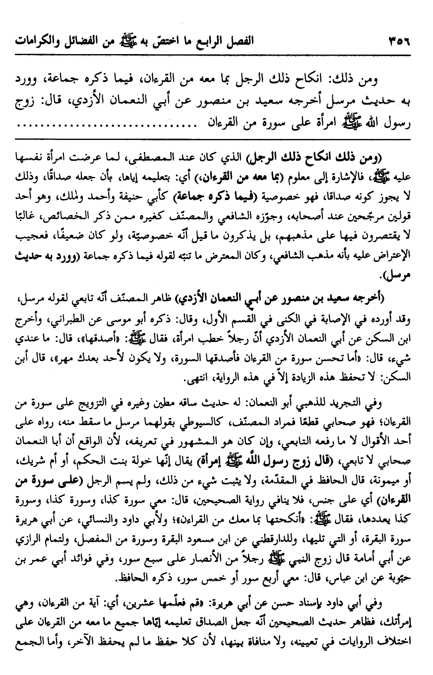 ومن ذلك: إنكاح ذلك الرجل بما معه من القرآن، فيما ذكره جماعة، وورد به حديث مرسل أخرجه سعيد بن منصور عن أبي النعمان الأزدي، قال: زوج رسول الله صلى الله عليه وسلم امرأة على سورة من القرآن.