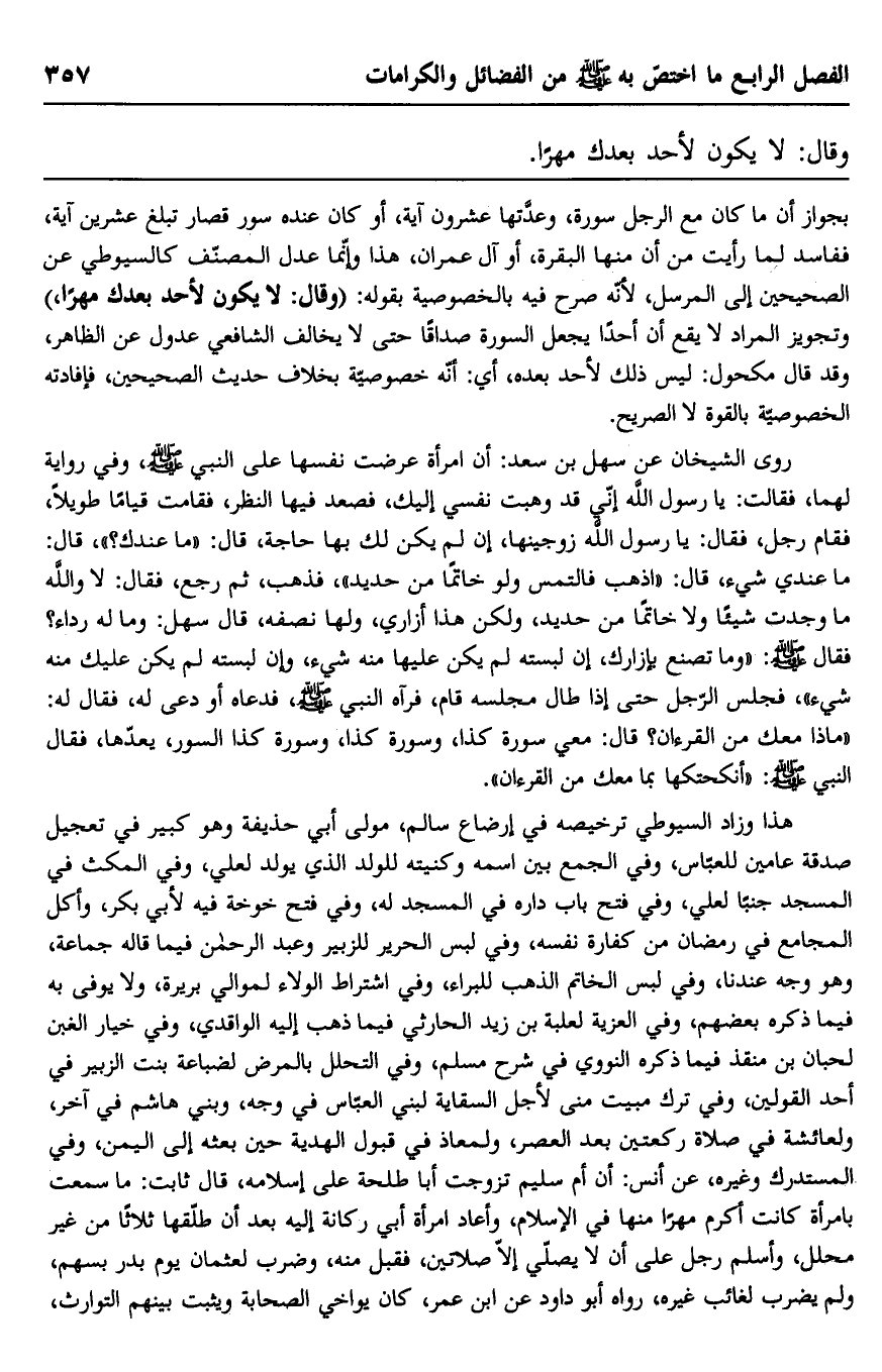 بجواز أن ما كان مع الرجل سورة، وعدتها عشرون آية، أو كان عنده سور قصار تبلغ عشرين آية، ففاسد لما رأيت من أن منها البقرة، أو آل عمران، هذا وإنما عدل المصنف كالسيوطي عن الصحيحين إلى المرسل، لأنه صرح فيه بالخصوصية بقوله: "وقال: لا يكون لأحد بعدك مهرًا" وتجويز المراد لا يقع أن أحدًا يجعل السورة صداقًا حتى لا يخالف الشافعي عدول عن الظاهر، وقد قال مكحول: ليس ذلك لأحد بعده، أي: أنه خصوصية بخلاف حديث الصحيحين، فإفادته الخصوصية بالقوة لا الصريح.