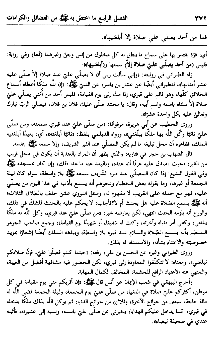 وروى الطبراني وغيره عن الحسن بن علي، رفعه: "حيثما كنتم فصلوا عليّ، فإن صلاتكم تبلغني"، ومعناه: لا تتكلفوا المعاودة إلى قبري، لكن الحضور فيه مشافهة أفضل من الغيبة والمنهي عنه الاعتياد الرافع للحشمة، المخالف لكمال المهابة.