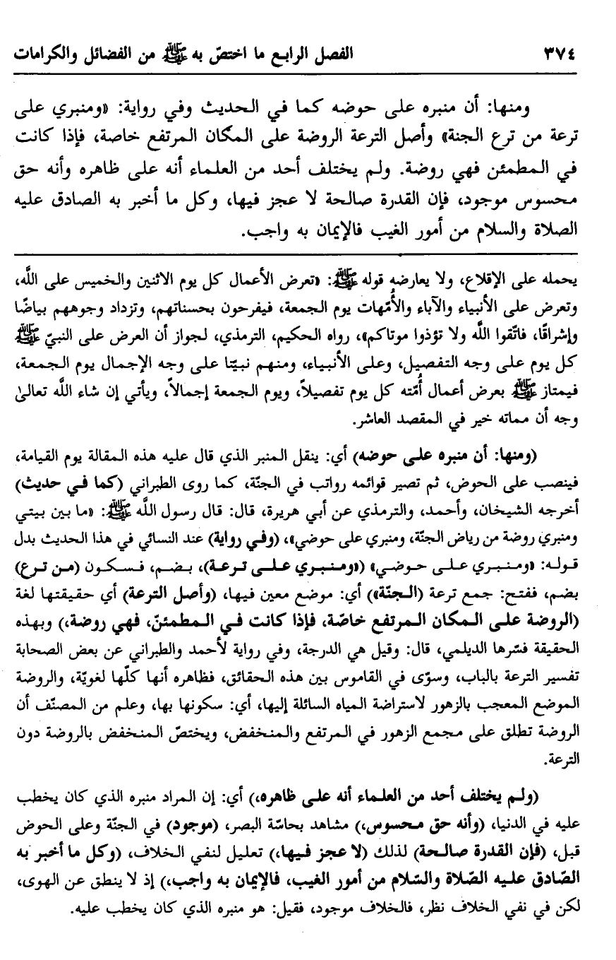 ومنها: أن منبره على حوضه كما في الحديث وفي رواية: "ومنبري على ترعة من ترع الجنة" وأصل الترعة الروضة على المكان المرتفع خاصة، فإذا كانت في المطمئن فهي روضة. ولم يختلف أحد من العلماء أنه على ظاهره وأنه حق محسوس موجود، فإن القدرة صالحة لا عجز فيها، وكل ما أخبر به الصادق عليه الصلاة والسلام من أمور الغيب فالإيمان به واجب.