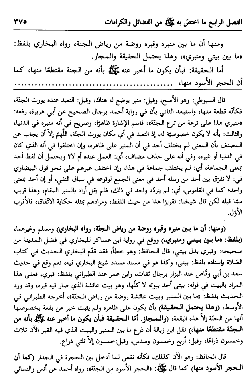 ومنها أن ما بين منبره وقبره روضة من رياض الجنة، رواه البخاري بلفظ: "ما بين بيتي ومنبري"، وهذا يحتمل الحقيقة والمجاز.