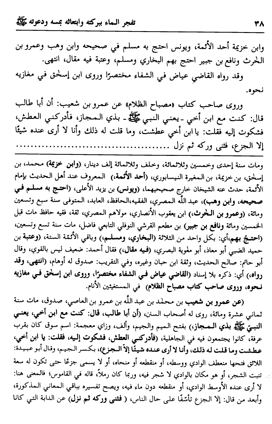 ومات سنة إحدى وخمسين وثلاثمائة، وخلف ثلاثمائة ألف دينار، "وابن خزيمة" محمد بن إسحاق بن خزيمة بن المغيرة النيسابوري، "أحد الأئمة" المعروف عند أهل الحديث بإمام الأئمة حدث عنه الشيخان خارج صحيحيهما، "ويونس" بن يزيد الأعلى، "احتج به مسلم في صحيحه، وابن وهب" عبد الله المصري، الفقيه، الحافظ العابد، المتوفى سنة سبع وتسعين ومائة، "وعمرو بن الحارث" ابن يعقوب الأنصاري، مولاهم المصري، ثقة، فقيه حافظ مات قبل الخمسين ومائة ونافع بن جبير" بن مطعم القرشي النوفلي التابعي فاضل، مات سنة تسع وتسعين، "احتج بهم، أي: بكل واحد من الثلاثة "البخاري ومسلم" وباقي الأئمة الستة، "وعتبة بن حميد الضبي أبو معاذ، أبو معاوية البصري، "فيه مقال" فقال أحمد: ضعيف ليس بالقوي، وقال أبو حاتم: صالح الحديث، وثقه ابن حبان وغيره، وفي التقريب: صدوق له أوهام، "انتهى، وقد رواه" أي: ذكره بلا إسناد "القاضي عياض في الشفاء مختصرًا، وروى ابن إسحاق في مغازيه نحوه، وروى صاحب كتاب مصباح الظلام" في المستغيثين الأنام.