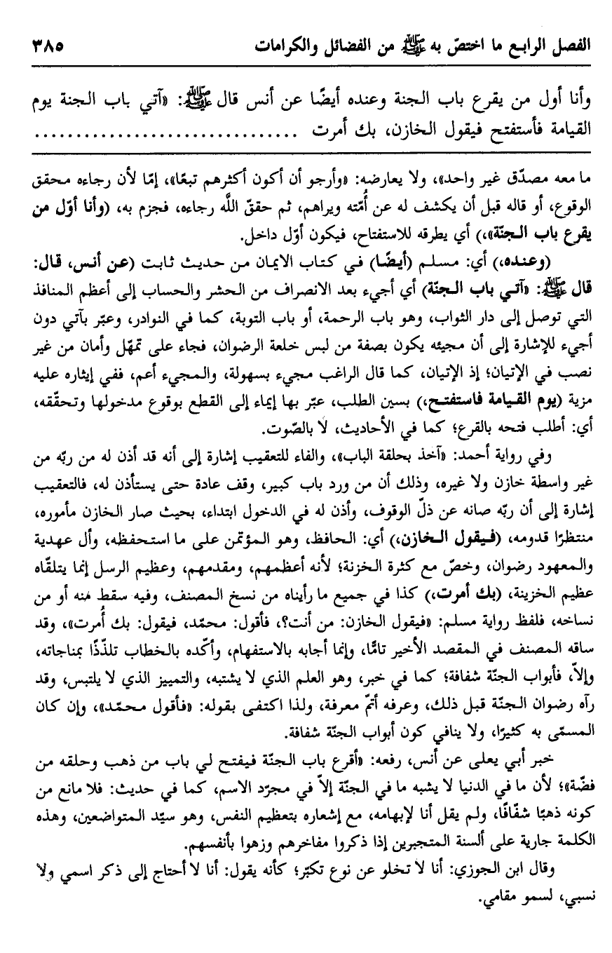 وأنا أول من يقرع باب الجنة". وعنده أيضًا عن أنس قال صلى الله عليه وسلم: "آتي باب الجنة يوم القيامة فأستفتح فيقول الخازن، بك أمرت