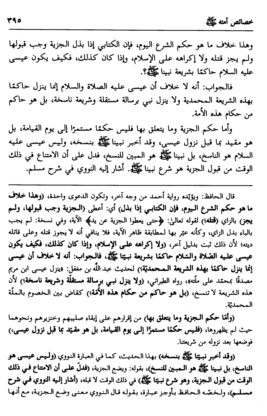وأما حكم الجزية وما يتعلق بها فليس حكمًا مستمرًا إلى يوم القيامة، بل هو مقيد بما قبل نزول عيسى، وقد أخبر نبينا صلى الله عليه وسلم بنسخه، وليس عيسى عليه السلام هو الناسخ، بل نبينا صلى الله عليه وسلم هو المبين للنسخ، فدل على أن الامتناع في ذلك الوقت من قبول الجزية هو شرع نبينا صلى الله عليه وسلم. أشار إليه النووي في شرح مسلم.