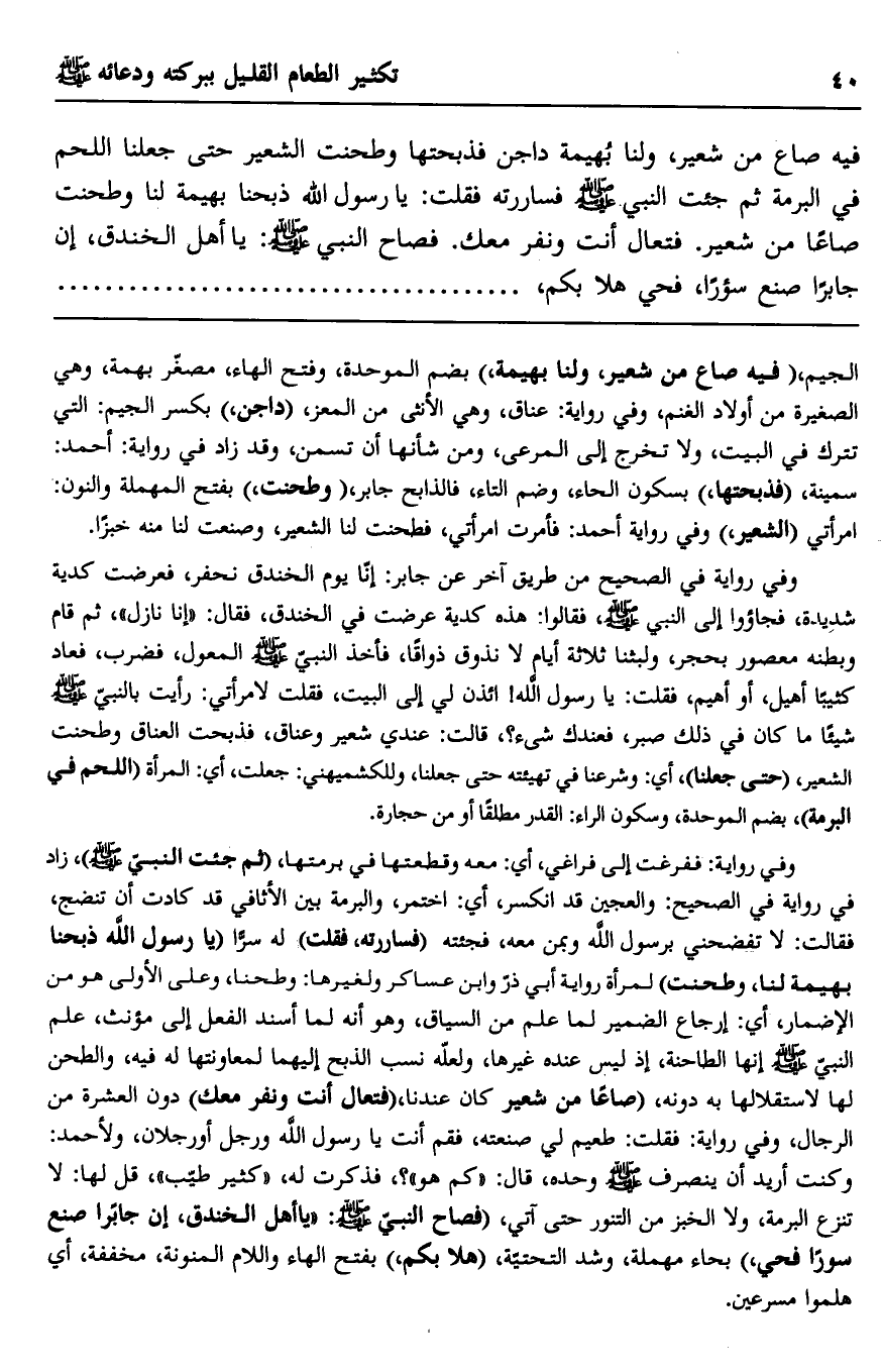 فيه صاع من شعير، ولنا بهيمة داجن فذبحتها وطحنت الشعير حتى جعلنا اللحم في البرمة ثم جئت النبي صلى الله عليه وسلم فساررته فقلت: يا رسول الله ذبحنا بهيمة لنا وطحنت صاعًا من شعير. فتعال أنت ونفر معك. فصاح النبي صلى الله عليه وسلم: "يا أهل الخندق، إن جابرًا صنع سؤرًا، فحي هلا بكم".