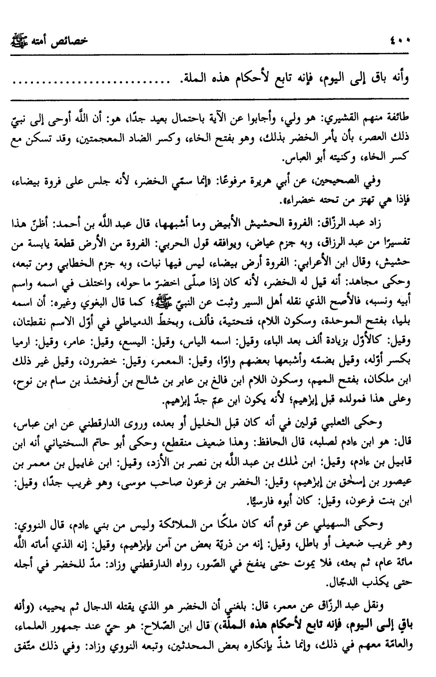 طائفة منهم القشيري: هو ولي، وأجابوا عن الآية باحتمال بعيد جدًا، هو: أن الله أوحى إلى نبي ذلك العصر، بأن يأمر الخضر بذلك، وهو بفتح الخاء، وكسر الضاد المعجمتين، وقد تسكن مع كسر الخاء، وكنيته أبو العباس.
